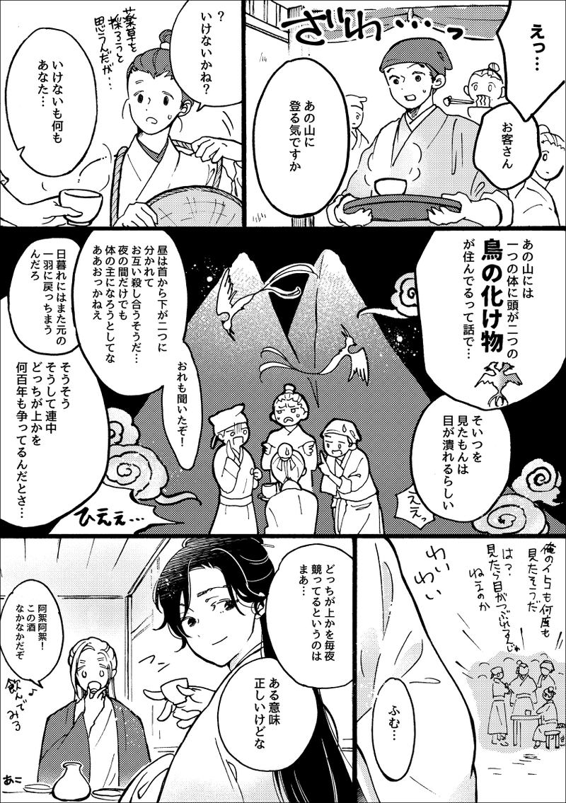 山のあちら側のふもとでは神仙の伝説になり、こちら側のふもとでは妖怪の伝説になったりしている二人。時々伝説の張本人たちがふもとの飲み屋に出没するも気付かれず