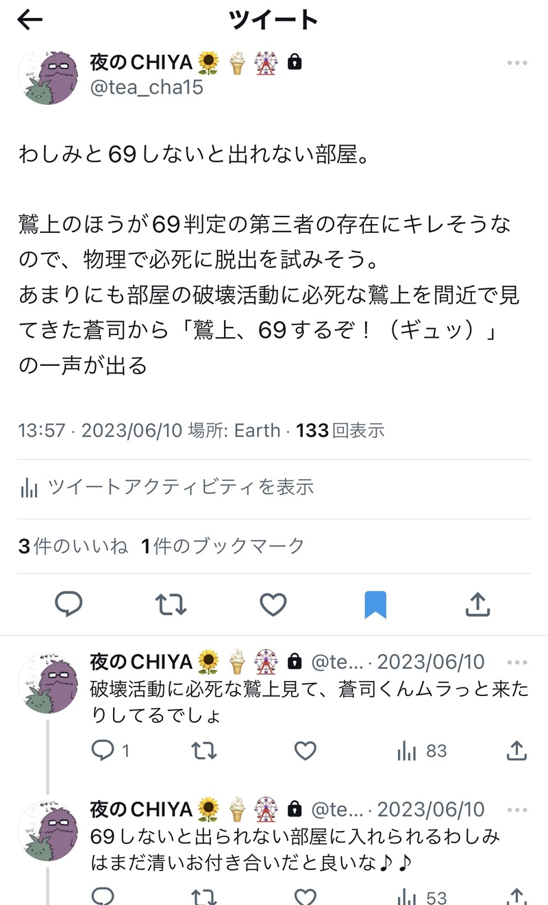 chiya_stok☆quiet followMOURNING●●しないと出られない部屋(鷲三の場合?) #星つむ3 Tap to full screen (size:1125x1858).Repost is prohibited Let's send reactions! freqpopularsnackothersPayment processing Replies from the creator Follow creator you care about!☆quiet follow chiya_stokMAIKING仁科くんのかわりに芸能人格付けチェックに出ることになった三上くんの話を描きたかった…っ!! chiya_stokMOURNING●●しないと出られない部屋(鷲三の場合?) chiya_stokMOURNING●●しないといけない部屋、拓蒼の場合? chiya_stokMOURNING巽と三上が●●しないといけない部屋に入ったらのネタツイいつか形にしたい。 chiya_stokPAST拓蒼ぬい宮崎3泊4日旅行記録!拓蒼オンリーの時までに旅行レポまとめたいな 17 chiya_stokPAST拓蒼ぬい水戸日帰り旅行編 15 related works chiya_stokMOURNING●●しないといけない部屋、拓蒼の場合? chiya_stokMOURNING巽と三上が●●しないといけない部屋に入ったらのネタツイいつか形にしたい。 chiya_stokPAST拓蒼ぬい宮崎3泊4日旅行記録!拓蒼オンリーの時までに旅行レポまとめたいな 17 chiya_stokDONE星つむ3展示 笹三 漫画と元ネタツイ漫画自体はpreview画像が「❓」になってしまっているのですが、❓をタップすると漫画の画像が表示されるようです。(画像がおおき過ぎてこうなっちゃうみたい)それでも漫画見れない場合はTwitterで連絡くださると嬉しいです。※随時ネタ増やす予定13時頃 2日目のネタ追加しました18時頃 3日目のネタ追加しました 4 chiya_stokMOURNING●●しないと出られない部屋(鷲三の場合?) chiya_stokPAST拓蒼ぬい水戸日帰り旅行編 15 chiya_stokPAST拓蒼ぬいおでかけ+人形遊びいろいろ2023前半(横浜舞浜国際展示場etc 27