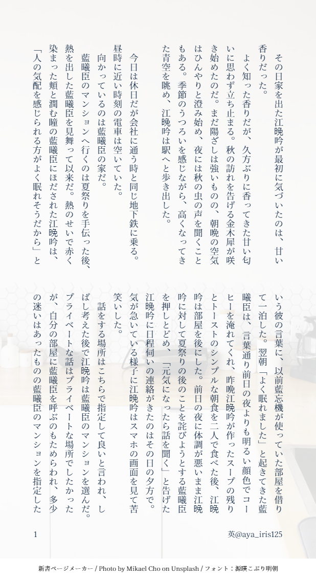 英(aya)☆quiet followDONE【現代AU】コーヒースタンドオーナー兄上×働き過ぎなリーマン澄⑧7.5↓の続きです。https://poipiku.com/2474980/7321784.html show all(+8 images) Tap to full screen (size:618x1132).Repost is prohibited Let's send reactions! freqpopularsnackothersPayment processing Replies from the creator Follow creator you care about!☆quiet follow 英(aya)DONE曦澄ワンドロワンライ第116回お題:詩 2384 英(aya)DONE【曦澄】第112回ワンライのお題「水浴び、泳ぐ」を加筆修正の上、たまゆらさんとのお話を参考に書いた続きです。たまゆらさんがポストされた内容も参考にさせて頂いています。(許可いただき済)***更に加筆修正(加筆部分は8P目以降)したので差し替えました。今度こそおしまいです。 11 英(aya)DONE以前途中まで公開していたお話を3/21-23のイベントに合わせ完結させました。【現代AU】曦澄江澄が勤める会社に転職してきた藍曦臣。彼が水をかけられたところを助けた江澄は、食事に誘われて… 31 英(aya)DONE【現代AU】社長の兄上×ホテルウェイターの澄の話⑨ 17 英(aya)DONE【現代AU】デパート勤務の兄上×カメラマン澄ジンイー君視点で、スージュイもいます(CP要素は無し)七五三のある世界です。 6 英(aya)DONE【現代AU】同じ会社の営業部兄上×経理部澄の曦澄未満のお話です。後半は夕方に。→後半載せました。5ページ目以降が後半です。 9 recommended works 谢谢喜欢DOODLE其实大多单人向。。有一张性转 13 kakitaineDONE12/15に配布した、好きなシーンをただ叫んだ紙 2 🐣堅揚げひよこ🐣DOODLE⚠️冒涜都市Zのネタバレあり37歳でこんなにもきゃるっとしているんだから、士官学校時代はほぼ妖精さんだったよ!!!!アリス嬢が見惚れてしまうのも無理はない。手が早いアーサー、永遠に好き Ak1cha_hakaDOODLE灰よか げんみ❌ 2 kurage_honmaruDONE「試すがいい、カマソッソの鮮血を!」2024年12月、Lostbelt No.7 黄金樹海紀行 ナウイ・ミクトラン 振り返りCP開催中‼️更に今月下旬には 振り返り特番/ミクトランシアター配信もあるよ‼️ミクトランがこれまで以上に愛されますように怖い顔は初めて描いたので勉強になりました、2枚目は表情変化「——待っているからな」 2 yurikoniccDOODLEフォロワーさんの好きカプを勝手に描く③シロうら 月の石MOURNING話を書くとき、ワンシーン浮かんでから書き始めることが多いんだけど、それぞれの話の浮かんだワンシーンとか発想の源を書き留めて置くやつ。更新していく。 1415 阿粒OVOTRAINING新买了水彩纸,试试看有点emo的小凛追加一只阿豪 2 まわたDOODLEFF11 メリースターライト顔かわいく描けた気がする、嬉しい
