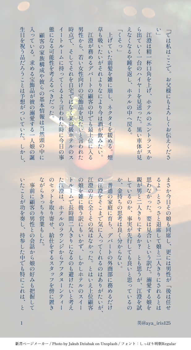 英(aya)☆quiet followMOURNING【現代AU】お酒を飲める兄上が書いてみたかったので。お酒の飲めない、高貴な世界とご縁のない人間が書いたので細かい所は目をつぶって許していただける方だけお読みください。前半だけモブ親子が出ます。 show all(+4 images) Tap to full screen (size:618x1132).Repost is prohibited Let's send reactions! freqpopularsnackothersPayment processing Replies from the creator Follow creator you care about!☆quiet follow 英(aya)DONE曦澄ワンドロワンライ第116回お題:詩 2384 英(aya)DONE【曦澄】第112回ワンライのお題「水浴び、泳ぐ」を加筆修正の上、たまゆらさんとのお話を参考に書いた続きです。たまゆらさんがポストされた内容も参考にさせて頂いています。(許可いただき済)***更に加筆修正(加筆部分は8P目以降)したので差し替えました。今度こそおしまいです。 11 英(aya)DONE以前途中まで公開していたお話を3/21-23のイベントに合わせ完結させました。【現代AU】曦澄江澄が勤める会社に転職してきた藍曦臣。彼が水をかけられたところを助けた江澄は、食事に誘われて… 31 英(aya)DONE【現代AU】社長の兄上×ホテルウェイターの澄の話⑨ 17 英(aya)DONE【現代AU】デパート勤務の兄上×カメラマン澄ジンイー君視点で、スージュイもいます(CP要素は無し)七五三のある世界です。 6 英(aya)DONE【現代AU】同じ会社の営業部兄上×経理部澄の曦澄未満のお話です。後半は夕方に。→後半載せました。5ページ目以降が後半です。 9 recommended works momoju1124DOODLEサロメを演じる🌻さん高身長アイドルタカダちゃんの代役女装している sushiDOODLE瀬名泉 女体化 リクエスト 404namelessDOODLEIF瓷(♀),跟♂没啥性格区别含苏+契卡切片,以及三只小熊 5 Lúa MìDOODLE Lúa MìDOODLE 早稻🌾TRAININGこぎみか・黄金色に染まった大銀杏はもう小狐丸の概念そのものなのでは…という気持ち・口の大きさの違いを改めて実感してほしさ・獣形態の小狐丸のこぎみかが見たい!の全部盛り 3 MヘルツPROGRESS sirome0_0DONE落書きくん「僕に落書きしたの、だーれだ。お前」女の子に買われて女の子と間違えられてお化粧しましょうねーなんて言われながら落書きされていた 709 佐伯櫻DONEhappy birthdayです大岳さん~~~~~!!!!あいも変わらず背景と文字のセンスが無さすぎるのですがちょっと怖そうな雰囲気にできて良かったです それはそれとしてお誕生日スト、ユウキさんとめちゃくちゃ仲良くてすっごくhappy これからどうなっていくか楽しみでなりません!改めておめでとうございます~~~!!!!