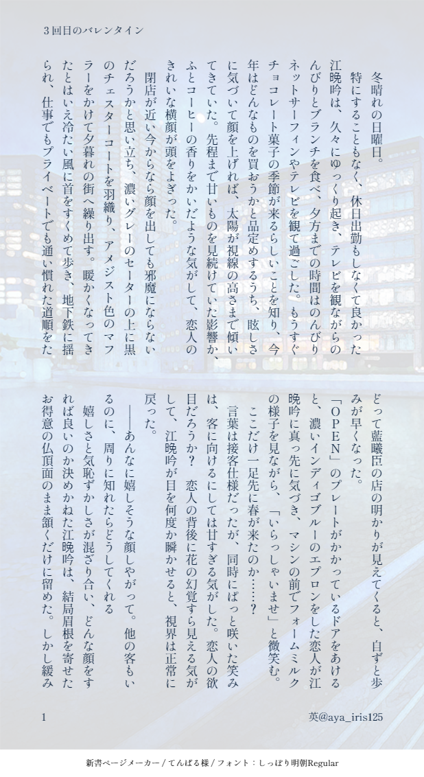 英(aya)☆quiet followDONE【現代AU】コーヒースタンドオーナー兄上×働き過ぎなリーマン澄3度目のバレンタインデーです。これまでの話はひとまずミントにまとめています。https://min.togetter.com/kq1SVM4 show all(+9 images) Tap to full screen (size:618x1132).Repost is prohibited Let's send reactions! freqpopularsnackothersPayment processing Replies from the creator Follow creator you care about!☆quiet follow 英(aya)DONE曦澄ワンドロワンライ第116回お題:詩 2384 英(aya)DONE【曦澄】第112回ワンライのお題「水浴び、泳ぐ」を加筆修正の上、たまゆらさんとのお話を参考に書いた続きです。たまゆらさんがポストされた内容も参考にさせて頂いています。(許可いただき済)***更に加筆修正(加筆部分は8P目以降)したので差し替えました。今度こそおしまいです。 11 英(aya)DONE以前途中まで公開していたお話を3/21-23のイベントに合わせ完結させました。【現代AU】曦澄江澄が勤める会社に転職してきた藍曦臣。彼が水をかけられたところを助けた江澄は、食事に誘われて… 31 英(aya)DONE【現代AU】社長の兄上×ホテルウェイターの澄の話⑨ 17 英(aya)DONE【現代AU】デパート勤務の兄上×カメラマン澄ジンイー君視点で、スージュイもいます(CP要素は無し)七五三のある世界です。 6 英(aya)DONE【現代AU】同じ会社の営業部兄上×経理部澄の曦澄未満のお話です。後半は夕方に。→後半載せました。5ページ目以降が後半です。 9 recommended works Nnn_d12PAST 8 鬼忍者可愛いDOODLE⚠腐向け 少年 R15 ⚠クレナイ君のお家にお泊りした翌朝の生着替え♡このまま昨日の続きに突入したい衝動にからせてくれっ! いもねこDONEクリスマスデートセキカイの自己解釈2p漫画(ネタバレ)ありがとうポマ🙏 2 9babbabbab6SPOILER※最終巻の内容が含まれていますgntm最後まで最高だったありがとう onokanata2DOODLEふた練 Mentos_38DOODLE春追い げんみ❌ネタバレいろいろもろもろ。線が汚いのはいつものことです 6 CTHULFUyariteeDOODLEかいとうらんまげんみばつ 自陣一旦ばつどうしようもねえ自宅のrkgk 3 sc_keiDOODLE12/16:鶴丸 りゅう/龍DOODLE【実録漫画】西武園ゆうえんちゲ謎コラボ最後だしせっかくだから飲んだほうが良い。覚悟を決めて付き合うと言ってくれたから一緒に同じクリームソーダ(ゲ謎コラボ)を飲んでくれるんだと思ったら、完全に裏切られた😇私のはもうクリームソーダ頼んだあとだった。許さない😇💢