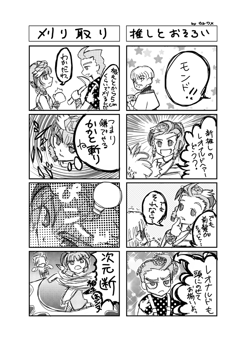 kashiwame☆quiet followDONEサガエアフェス4のアンソロ ミラクルシンフォニー2 に寄稿したサガスカ4コマ作品。こちらはレオナルド×ウルピナ。ピナちゃんの飽くなき好奇心と、仮面ヤンキー農業マニアなレオナルドの組み合わせ、割とすきです。 #サガスカ #サガエアフェス4 sagaAirFest4 Tap to full screen (size:3638x5102).Repost is prohibited Let's send reactions! freqpopularsnackothersPayment processing Replies from the creator Follow creator you care about!☆quiet follow kashiwameDONEほんとは、つどやく(オンイベ)目標だった、ふわふわバッジのロマ2ハクゲン。これでもかってくらいぷにぷにほっぺ主張してくれてます。pass: hakugen kashiwameDOODLEこの空間でwwwwこのサイズwwwwになってしまったシゲン。 kashiwameDONE出来心で作った、ロマ2コウメイさんのぷに缶バッジ。PW : koumei 元絵はこっちのhttps://cara.app/post/b17a51fa-78a8-4e32-9cae-8cf597e92bf2 kashiwameDOODLEロマ2コウメイさん。ちょっとずつ、描きたい感じになってきた・・・かも? kashiwameDOODLE昨日に続いてクリスタのブラシを試したいからって謎犠牲になった軍師ちゃん。油彩ブラシ、もうちょっと合うように調整すれば、ありかもしんない。あと、途中でパース変えようとするのだめっすね。顔と足の角度修正しきれなかった。 kashiwameDOODLEクリスタのペンの太さ感に慣れたいっていうのは、つまり、こういうのを描いてみていてて、なんかいろいろコレジャナイナってなってああなった。ね。どうしてこうなった、でそ?(ああなった)https://poipiku.com/248488/11779646.html related works kashiwameDONE #サガエアフェス4 開催記念のアンソロジー ミラクルシンフォニー2 に寄稿した作品の、背景黒版です。絶対白と黒しか使わないつもりで描いた作品。背景を黒の方がきっとこっちのほうがチアーゴさんの魅力には合ってるのだろうと思いつつも、白の方のイメージで作ったので、寄稿時は背景白です。 いぬっちPAST【サガエアフェス4 展示】過去発行したペーパーのカットです。画像荒くてすみません!下4枚は1997~2013年発行したペーパーから寄せ集めました。1997年以前分もあるのですが…さすがに見るに堪えなかったのでやめておきました(笑)。「この絵見たことある!懐かしい~!」なんて思ってくれる方が一人でもいたら嬉しいのですけど…♡ 11 kashiwameDONEサガエアフェス4のアンソロ ミラクルシンフォニー2 に寄稿したサガスカ4コマ作品。こちらはレオナルド×ウルピナ。ピナちゃんの飽くなき好奇心と、仮面ヤンキー農業マニアなレオナルドの組み合わせ、割とすきです。 recommended works guuko416PASTサガスカのバルマンテとアーサーフォロワーさんの絵を自分の絵柄で描く企画で描かせていただきましたシグノボールペン、ウィンザー&ニュートン使用 h!63(ヒロミ)PAST七英雄MAD画像その1。七英雄(その他)キャラをギルティギア(XX)でトレス。 11 ダリア(Dah.)TRAININGうるぴな(ちょっと修正 咖哩なんぽ(アンポ)PASTピナ祭りと聞いて!サガスカのウルピナちゃんです。カラーが似ているので、手にうちのインコを乗せてみました! ダリア(Dah.)MAIKINGワンドロ描いてみたヴァッハ神(時間切れ ねいびーDONE完成品ポイ。最近リユニはイベントストーリーがないけど、また最終皇帝とハンニバルの会話が見たいなぁ。課題ありまくりなので基礎練に戻る_(:3 」∠)_2021/02 mumeimukimeiDOODLEサガスカのリコ。いかつい顔なのにかわいいと思うのはやはりピンクの力なのか・・・。 towtezDOODLEサガスカプレイ記3ウルピナ編で仲間にしたカーンがすごく使いやすくてキャラも良くてお気に入りです。エンディングのその後のお話でスカウトされてたし、ユラ家のひとたちカーンのことすごく気に入りそう。好戦的なセリフ多いしね。ユラニウス兵団では強敵とのバトルは福利厚生のうちなので…(妄想) 2 towtezDOODLEサガスカプレイ記62周目はバルマンテを選びました。彗星に任せてないのでデフォマンテさん。サガスカって仲間キャラにほとんどセリフがないのはサガシリーズ恒例ですが、それぞれにパートナーがいることでずっと二人で掛け合いしながら旅してる感じが新鮮ですごく良いです。これは今までのシリーズでは無かった感覚。キャラも世界観も掘り下げられて楽しいです。 2