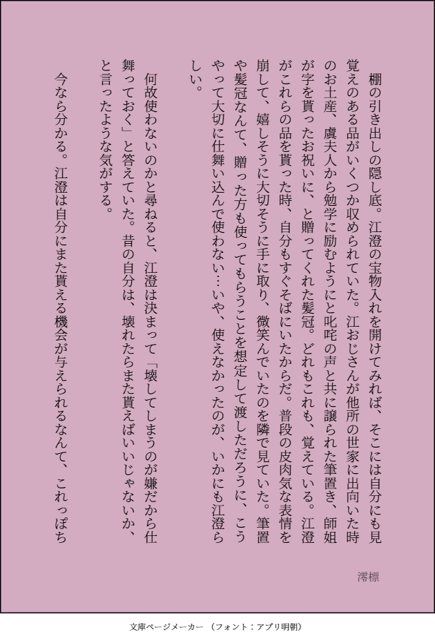 澪標(みおつくし)☆quiet followDONEひとりで先にいってしまった江澄を、魏無羨が見送る話 ④※死ネタです※魏無羨目線※根底は曦澄だけど曦に妻子がいます(名前はありません)※魏無羨がやっと江澄を理解する話でもある※もうちょっと続く #曦澄 #江澄 lakeshore #魔道祖師 GrandmasterOfDemonicCultivation show all(+5 images) Tap to full screen (size:630x928).Repost is prohibited Let's send reactions! freqpopularsnackothersPayment processing Replies from the creator Follow creator you care about!☆quiet follow 澪標(みおつくし)DONEoffさんの年末の辻斬り占いで書くと良いでしょうって言われた曦澄でござる。初めてのセンシティブ(もどき)……楽しい……フォロワッサン限定でおなしゃす。🔞ということで、18歳以上の方でお願いします🙇♀※この兄上は、前回の蓮華塢での逢瀬の時に江澄の愛棒である張型四兄弟(伯根、仲根、叔根、季根)にちょっかいを出しています。 1987 澪標(みおつくし)SPUR ME進捗進捗進……進まねぇ……次のターンから藍曦臣パイセンのご登場です。 1411 澪標(みおつくし)PROGRESS今後発行予定の曦澄小説本に収録する「肝だめしに行ったら憧れの先輩とお浄めセッ(以下略)」の冒頭部分だけ公開いたします。起承転結のまじもんの起のみです。曦澄の曦の字も出てないですがこのあと澄はまぁまぁ怖い目に合い、まぁまぁやばい事態となり、そしてお浄めセッに至ります。何度も。 6063 澪標(みおつくし)SPUR MEホラーが、ホラーがわからぬ……༼⁰o⁰;༽ 1209 澪標(みおつくし)SPUR ME尻叩きその②江澄が所属しているのは映画観賞同好会(好きな時に好きな映画を見て好きな時に感想を言い合う)です 1607 澪標(みおつくし)SPUR ME交流会で出したいお話の進捗!!!!尻叩きです!!!書くぞ書くぞ書くぞ…曦澄になるのですがまだ江澄とモブしか出てない。現代AUです。 1272 related works はゆやSPUR MEオメガバース忘羨匂わせ程度のすけべな描写あり設定はこちらhttps://twitter.com/soushokukoebi/status/1483004515385507840?s=21 2605 emi_smile_m__mMAIKING初投稿。 ごーるDOODLE待ちぼうけ⚠︎Attention⚠︎全て個人の妄想によるフィクションです。実在の人物・団体・事象とは一切関係ございません。無断の転載を固くお断りします。It's all an individual fantasy fiction. 藍湛の悪夢。ハピエンです!!阿令設定ですがまどそしでも。痛いほどに、愛しく思う。 9 kd1ty4_ko_2MAIKINGNLでも描いたことなかった肌色系、描いてみたいと思わせる魔道祖師(忘羨)、恐るべし笑完成するかどうかは不明😂 九夏BOXPAST毎日一緒に寝てくれるんだろ? 伊東しんDOODLE魏嬰と金凌が凄く好みです やっすーTRAINING魔道祖師の魏嬰ちゃんです! 西村ルルMOURNING書けないから供養。長い設定つき。現代AU、男子校パロ。魏嬰が藍湛の🍆を口にする描写があるので、R18にしています。乳首触ったとこから進まず、途中放棄してしまいました😂 1804 とさみくMAIKING recommended works sgmDONEMXTXオンラインパーティー用新作でした。江澄と初めてキスしてド浮かれな藍曦臣。当日はスペースまでいらしていただきありがとうございました。書き込みボードにマロ、リアクション、どれも嬉しいです! 25 キ・リンDONE「徒途単」11P土産の話。#曦澄2021/7/4 11 sgmDONEお野菜AU。雲夢はれんこんの国だけど、江澄はお芋を育てる力が強くてそれがコンプレックスでっていう設定。 2006 だみぃにゃんDOODLE兎さんのかわいいイラストにタグが付いていたのでうっかり...(以下略 624 kana_hoshinoyaDONE曦澄オンリー開催おめでとうございます!思うように準備できなくてできたとこだけですが…続き描いたらじわじわ足していきます。0518 5p追加 20 youmeihyDONE金光瑶誕生日ギャグ漫画。「食の好みが合わない三尊」 corico81ricoDOODLE1枚目この姉弟好き。2枚目完全なる私の性癖この首と肩のラインこココ!!!ココ!!!ココ!!! 2 kyo_joymdzsPROGRESS魔道祖師の二次小説『四季折々に君を想う』シリーズの『#2 夜桜の下で君を想う』(https://www.pixiv.net/novel/show.php?id=17170054)の挿絵を描いたところ、それにインスピレーション湧いて、フルカラー漫画を作りました。表紙の絵の構図が浮かんで、これを描きたかったと言っても過言ではありません。脳内ではアニメーションでしたが、画力が足りず背景適当です。 5 nokibi_akiDONE大切な家族だと、大きな声で! 4