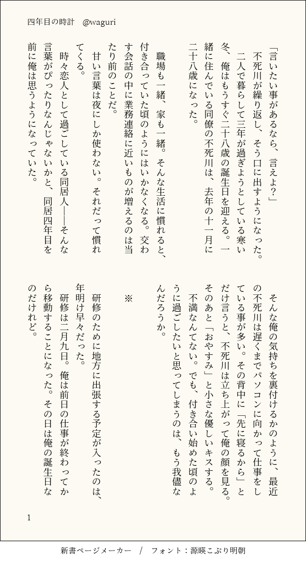 waguri1154☆quiet followDONE四年目の時計現パロ、教師で同僚一緒に暮らして3年28歳の義勇さん誕生日のお話です show all(+7 images) Tap to full screen (size:618x1132).Repost is prohibited Let's send reactions! freqpopularsnackothersPayment processing Replies from the creator Follow creator you care about!☆quiet follow waguri1154INFOテスト 2 waguri1154DONEわがままをひとつ現パロ、キ学同僚、記憶ありのさねぎゆですまだ付き合ってませんお互いに記憶があることは知らない二人の雨の日のお話ですワンライに参加させて頂いたものですお題は「わがまま」「痣」でした 7 waguri1154DONE百年後、年上の君に逢う 現パロ、教師で同僚、二人とも記憶あり付き合っている25歳のさねぎゆが卒業式の後、袴姿でお花見に行くお話ですワンライに参加させていただいたものですお題「あなたに微笑む」「花嵐」お借りしました春だ!桜だ!さねぎゆだ!袴姿で桜見て!!…みたいな感じの折本を作りたくて書きました短いのですが楽しんでもらえると嬉しいです! 7 waguri1154DONEうっかり指輪を買っちゃったとみセンの話現代キ学、教師で一緒に住んでるさねぎゆです。ホワイトデーのお返しに義勇さんが指輪を買ってしまうお話です。 9 waguri1154DONE四年目の時計現パロ、教師で同僚一緒に暮らして3年28歳の義勇さん誕生日のお話です 8 waguri1154DONE冬のいちご (新作) 約4000字 現パロ。キ学で同僚、付き合ってる二人が小さな諍いをした後の冬のお話です。ハピエンです。 9 recommended works ぽめ🌞💎DOODLEお尻こkしてくれるけど、音也が余計なこと言うからめちゃくちゃ塩対応のトキヤ(笑)※2000%衣装の音トキむかついて強めに挟んできそう(笑)ちんこ取れるって!って言って欲しい(笑)(笑) チヂミ飴DOODLE(DSエラーくんできゅうくらりんできちゃう) 岸川珪花TRAINING🏠🖋️(2025/01/13) machigata___DOODLEフェラミネ(最悪) Ronge_UmeeeeDOODLE怪おにげんみ❌一宮のふせのやつ hirooo_santaSPOILER🛑 『月へ行こうよと君は言った』『海も枯れるまで』現行未通過✕ 🛑月君で使用したものたちを集めました!ひょっとしたら落書きとか漫画が増えるかもしれないので、各陣(?)に分けて上げていくぜ。 11 🌸有也PAST新千ちゃん🌼 puyonaponapo0DOODLEワンクッション⚠️表で晒すの恥ずかしいからこちらに置いてく相手は誰かお任せします kokuthigomiDOODLEなんだこれ_(:3 」∠)_ムさんがお預けになってるだけの謎マンガ