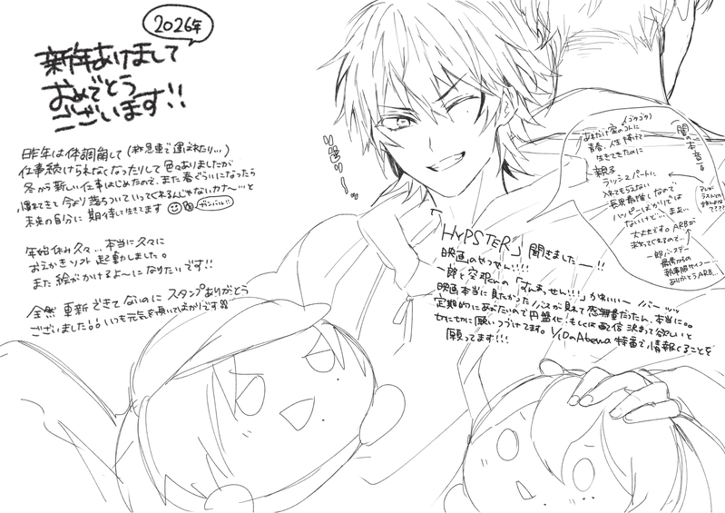 2026年になっちゃってました!今年も楽しみです!! 久々のらくがきと呟き!昨年は楽しいはずなのに体調がだめで体と心が日常についてってない感じになっちゃってたので、今年はなるだけ元気に生きて、良い年にしたいです!年末年始は良いことばかりでした^^ノ 20260103