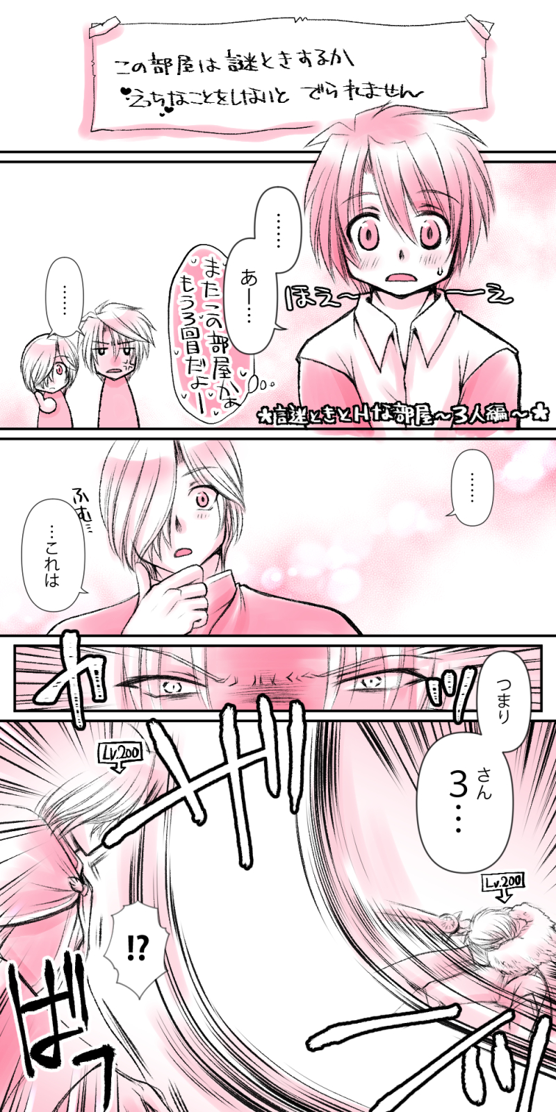 前にRTでまわってきて、思いついたのでつらつら描いてた「謎解きをするかHなことしないと出られない部屋に閉じ込められたらどうする?」の最後は、3人で閉じ込められるバージョンです\(^o^)/ 完結編。