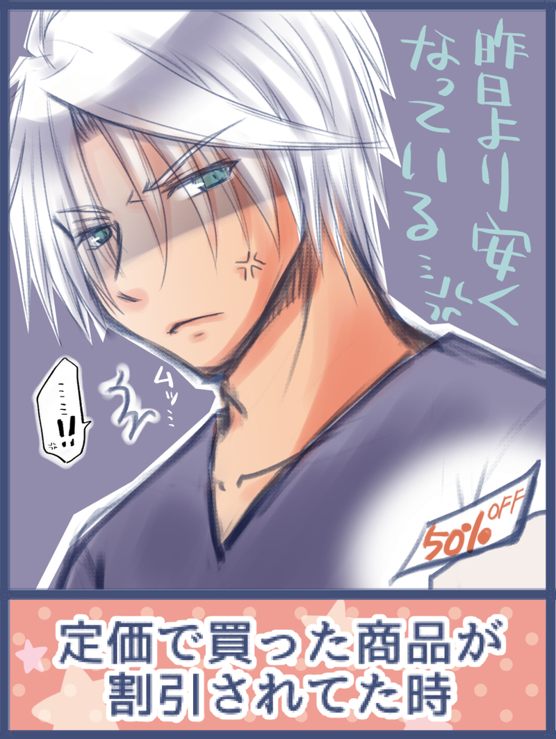 【表情練習・上級者編】値引きされてるのみたら、ヴェルさんは、ちょっとムッとして、マユリは「わーーん!今日見たら値引きされてた〜><」って愚痴って、アルさんは「おやおや?タイミングが悪かったですね」って見ないふりをする…( ˘ω˘ )