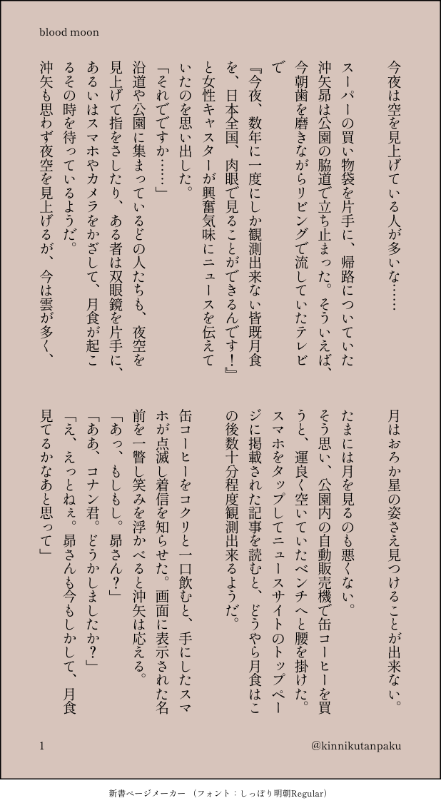 kinnikutanpaku @kinnikutanpakuたんぱくです。緋色をきっかけに二次創作始めました。安コ、昴コ、赤コを中心に。 ☆quiet follow Yell with Emoji POIPOI 4