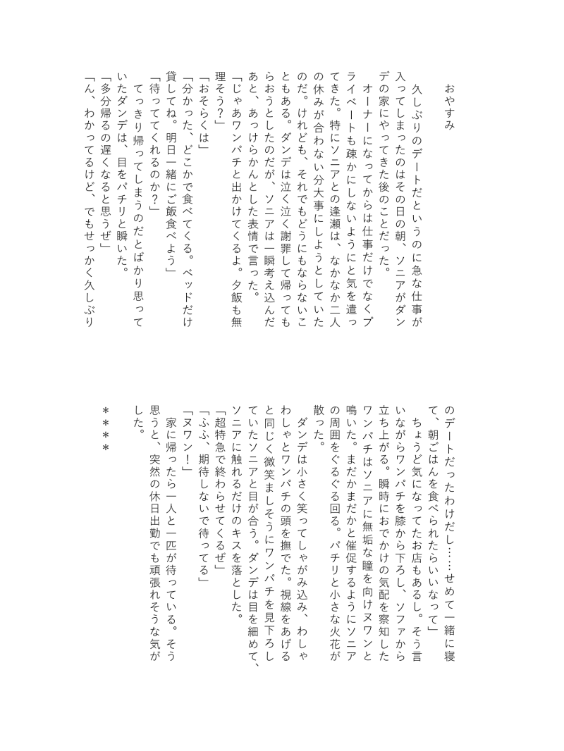 ngs_sgr_2☆quiet followINFO段組サンプルですこんな感じの短いお話の詰め合わせです。軽く読めるお話を目指したので、CMの間、パソコンの起動を待つ間、カップラーメンができるまでの3分などなどちょっとした隙間に読んでもらったら嬉しいです🙌💕 show all(+3 images) Tap to full screen (size:1536x2048).Repost is prohibited Let's send reactions! freqpopularsnackothersPayment processing Replies from the creator Follow creator you care about!☆quiet follow ngs_sgr_2INFO段組サンプルですこんな感じの短いお話の詰め合わせです。軽く読めるお話を目指したので、CMの間、パソコンの起動を待つ間、カップラーメンができるまでの3分などなどちょっとした隙間に読んでもらったら嬉しいです🙌💕 4
