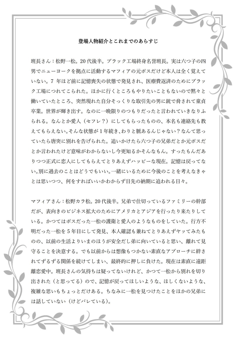 rokawall☆quiet followMEMOときどき書いてる班マフィのざっくり設定です。シリーズ『元◯◯な班長さんとつれないマフィア(仮)』https://www.pixiv.net/novel/series/1052682超ネタバレ。別に読まなくても大丈夫ですが、後日談まとめ本用に書いたものを発掘したのでペロッと置いておきます。 Tap to full screen (size:1774x2550).Repost is prohibited Let's send reactions! freqpopularsnackothersPayment processing Replies from the creator Follow creator you care about!☆quiet follow rokawallDONE神キュ(一カラ)R18?素直じゃない神父とのんびり草食系のカラキュバス、ポンコツ同士即落ち2行のなれそめ篇。神父視点の続きも書けたら書きたいです。 5 rokawallMEMOときどき書いてる班マフィのざっくり設定です。シリーズ『元◯◯な班長さんとつれないマフィア(仮)』https://www.pixiv.net/novel/series/1052682超ネタバレ。別に読まなくても大丈夫ですが、後日談まとめ本用に書いたものを発掘したのでペロッと置いておきます。 rokawallMAIKINGポリネシアンセッ…に挑んで失敗しまくる班マフィ① 「班長さん、ポリネシアンセッ…って知ってるか?」「なにそれ。サンバでも踊りながらヤるんですか?」ひとまず導入。クリスマス~ニューイヤー前後の話でえらい季節外れですが、景気づけにアップ。 10 rokawallMAIKINGポリネシアンセッ…に挑んで失敗しまくる班マフィ①ひとまず導入だけ。クリスマス~ニューイヤー前後の話でえらい季節外れですが、景気づけにアップ。「班長さん、ポリネシアンセッ…って知ってるか?」「なにそれ。サンバでも踊りながらヤるんですか?」 6 recommended works スピノINFOロロくんの杖の作画時短フリー素材配布中です🔔https://www.pixiv.net/artworks/107115106 A.JoanDOODLEngro18➕?(yes/no) 2 ともらす@お仕事募集中DONEぽいどさんの誕生日企画に寄せて描かせていただいたイラストです。✨キャラクタープロフィールはURL先から✨https://m-phoenixtemps.fanbox.cc/posts/8630719【キャラクター】ネクロラビア【使用ソフト】CLIP STUDIO PAINT【公開日】2024年2月 ArthurDONE2025年1月と2月のお絵描きまとめですᐕ)ノ🎨 20 su___diaDOODLE 4 itainotondeke11DOODLEnnrn rnちゃカントボーイのらくがき 筆が乗ったところまで 成人済?yes/no 3 minorinockDONEkiis(デキてる世界)バーで聞いた話を実践する41の話 3 ノッテリアDOODLE鷹野さんって「授乳手コキして」って言ったら粉ミルク作りだしそう。そして授乳と哺乳は違うとか言い出しそう。 C.(しー)DOODLE