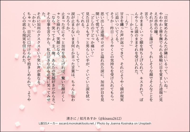 kisasu2612☆quiet followCAN’T MAKE朝の加州は、「かわいい」よりなのか「カッコいい」よりなのか。んで、最終的にどっちも好きってなる。 Tap to full screen (size:1365x954).Repost is prohibited Let's send reactions! freqpopularsnackothersPayment processing Replies from the creator Follow creator you care about!☆quiet follow kisasu2612DONEジュンブラ頒布の本に入れる予定のものです。本になる前に読んでもいいよ、という方はどうぞ。注)大人向け、フェラあり 16994 kisasu2612MAIKING今書けたとこまで。裏垢配信してる加州くんの話。主と結ばれない加州くんはどうしてるんだろう。その寂しいをどうやって埋めてるんだろうな、って思いながら書いた。この後は大人向けになる予定。 8009 kisasu2612MAIKINGおそらく最初に書き始めた刀さに。未完成。はじめは鶴さにが多かったなぁ。2017年に構想作ってた。何年放置してるんだ🤣加州清光が出てこない!!! 8505 kisasu2612MOURNINGふわ〜っと書いた。誰でも想像してもらえるように書いてったつもりだけど、やっぱセリフ入れるとキャラ固定されちゃうなー……難しい。タイトルだけは立派。タイトルから先浮かぶと中身がスカスカになる呪いにかかっている。 778 kisasu2612PROGRESSこれ、4エロ目です。今回のイベ用、コンセプト違うエロ四つ追加してやったぜ!あと一息だから無事終わるように応援してほしい。 kisasu2612DOODLEあまりに夢っぽくてきゃー\(//∇//)\ってなるのでフォロワー限定でここにこっそり。設定、自本丸に合わせると照れるし、清光がどうしても自本丸寄りな個体になっちゃうので照れることがわかった。 4771