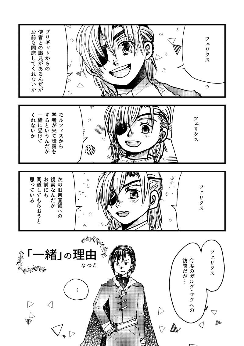 ntkfe☆quiet followDONEフェリディミアンソロに参加した漫画。 ##フェリディミ show all(+7 images) Tap to full screen (size:900x1277).Repost is prohibited Let's send reactions! freqpopularsnackothersPayment processing Replies from the creator Follow creator you care about!☆quiet follow ntkfePAST同人誌『真夏のドキドキゴーティエ兄弟』に収録したあぶらげさんにゴーティエ兄弟CP話のプロットを書いてくださいとお願いして現パロVerと原作Verを作っていただきなつこが漫画を描きました。という企画の漫画です!現パロ漫画と原作時空漫画がふたつ入ってます。2023.8.27 15 ntkfePASTCPっぽい感じのできてるシルヴァンとマイクランの漫画やイラストをまとめました。BL漫画を目指した(?)マイシルやシルマイっぽい絵と漫画です。現パロ作品だらけです。 34 ntkfePAST2023.11.23マイクラン兄上にリブローをかけてあげたいシルヴァンが魔法職を目指す無双時空のお話です。過去に描いたちびしるの漫画+その続きを描き下ろしています。幼少期~青燐ルートの兄上登場までの時間軸です。魔道学院とかゴーティエ兄弟とかちびシルヴァンの過去とかを色々と捏造しています。 36 ntkfePAST「ゴーティエ辺境伯家には二人の息子がいた。」2021.111185年(5年後)の約束の日前夜のシルヴァンがマイクラン兄上の部屋で兄上のことを考えているゴーティエ兄弟漫画。コナン塔は数年前のことになり、今はもう兄上のことは誰も知らないと思い込んでいるシルヴァンが兄上のことを忘れたくないと思っている話。(※うっすらマイシルを思わせる描写があるよ) 25 ntkfeDOODLE肌色絵なのでワンクッション(※健全な絵だよたぶん!!!)お風呂で部下の背中を流してくれる系マイクラン隊長です。弟は服を着ろ!!と大慌てです。2枚目は湯気差分で3枚目は何もないやつです。 3 ntkfePROGRESS6年目の小さなお茶会開催おめでとうございます!!👏☕!描き途中漫画なのでペン入れだけで力尽きています!フレンちゃんと青獅子学級のみんなが蒼月ルート後のフェルディアで同窓会的なことをする漫画の冒頭部分です!!5年目の同窓会で公開した8枚に続いて+10枚、18枚目まで展示します!続きはおいおいまた描きたいです……!!ドロテアちゃんが青獅子学級にいるルートでアッシュくんは王都で居酒屋をやってます。 18 recommended works yuberaTRAINING逆バニーつかさくんとガーディアン(+差分2枚) 3 ntkfePASTフェリクスとディミトリの温泉の思い出inフラルダリウス領(フォドラに温泉文化がある世界線)幼少期の思い出が暖かければ暖かいほど殿下の背中を見るたびにフェリクスは曇るんですけど5年後になんかこう色々あって色々飲み込む覚悟ができたら背中の傷を見ても曇らなくなるし暖かい思い出は思い出として大事にしていこうって気持ちになってくれると良いなって思っています…。 4 ntkfeDONE少年マイクランとちびシルヴァンと幼馴染たちが出てくるゴーティエ兄弟漫画。スレン戦役真っ最中の頃の話です。兄上初陣をはじめとする様々なあれこれをたくさん捏造しています。 32 matuyukiyoDONE幼少期のクロードがナデルと出会ってバルバロッサの白竜に名前をつける話(後日背景等加筆して同人誌作成、頒布予定です。その際には完成原稿も改めて全ページweb公開いたします。) 32 ntkfeDONEイングリットと青獅子にスカウトされたドロテアの蒼月ルート後のお話。騎士叙任式の前夜に口上が覚えられないイングリットとその練習相手として呼ばれたドロテアがいろいろお喋りしています。幼馴染組もちょこっと出てきます。 32 ntkfeDOODLE2022年上半期のゴーティエ兄弟らくがきまとめ(現パロが多い) 9 mmfe0831DONEこれまでもつもた企画で使ったイラストたちです。 14 mmfe0831DONE申込みカウントダウン&開催カウントダウンで使用したイラストです。①ゴーティエチャイナ②少年期③現パロ(コンビニ)④5年後シルと兄上⑥無双⑦現パロ(パルクール)⑧夏(浴衣)⑨夏(水着)⑩学生シルと兄上 9 ntkfeDONEどこかのルート後で魔獣になった兄上を世話している(?)シルヴァンの話です。 4