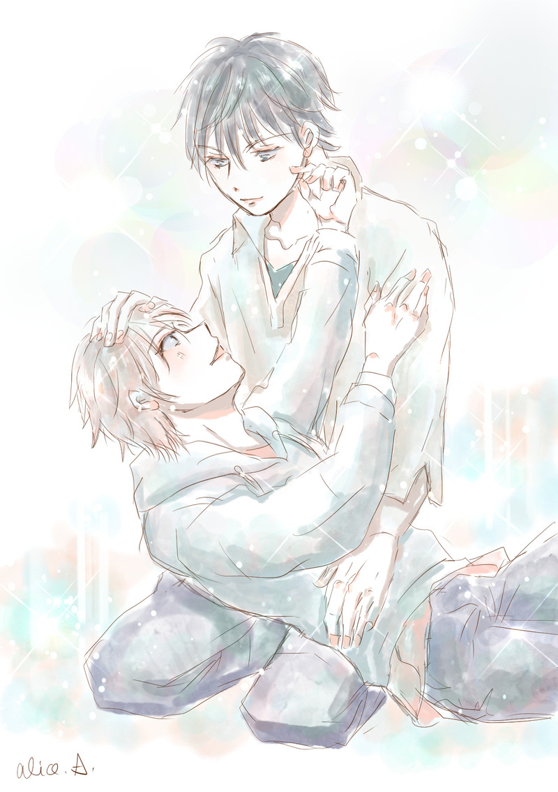 攻めが受けを膝に乗せて頭をなでてるところ…普段はケンカップルですが2人きりになるとsweetに。。🌱