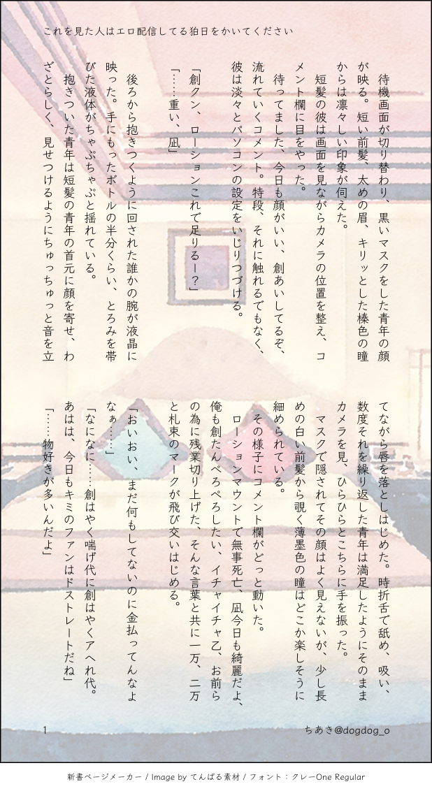 ちあき☆quiet followMOURNINGエロ配信してる狛日に投げ銭したいの儀没原稿の冒頭気に入ってたので供養します Tap to full screen (size:618x1132).Repost is prohibited Let's send reactions! freqpopularsnackothersPayment processing Replies from the creator Follow creator you care about!☆quiet follow ちあきMENU狛日成人向AVアンソロジー濃密♡Lovenest(ラブネスト)冊子の表紙と裏表紙になります。パッケージには狛枝日向共に黒目線が入ります。成人の方のみ閲覧ください。🔑 狛枝の背番号+日向の胸囲 ちあきDONE犬向くんオンリー用にかいたお話を全体公開します。獣人の狛枝と日向の話です。1枚目に注意書きがあります。卑猥なことはそれほどしてません。 16 ちあきDONEARKROYAL(おにショタ狛日)の番外。日向が終わった日、狛枝が本性を出した日の話。🔑 背番号+胸囲+y/n 16 ちあきMOURNING以前に書いたモブ女性と結婚する日向くんのことが好きだった狛枝の話です。狛→日ですが、日向くんからの矢印は一切ないそういう話です。幸せにはなれません。大丈夫な方だけどうぞ。 4 ちあきDONEテーマ ホラー。現パロ寄りの未来機関。狛日の要素、限りなく薄い。カムクラというより破壊者くん寄り 6 ちあきDONE本編軸の狛日(R-18)5章2日目くらい。性描写ありますので未成年の方はご遠慮ください。パスワードは背番号+胸囲+y/n 6
