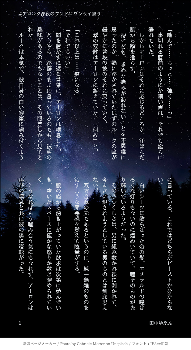 yuenbond☆quiet followDONE #アロルク深夜のワンドロワンライ祭り お題「傷痕」お借りしました。本編のネタバレがあります #アロルク allRounder show all(+2 images) Tap to full screen (size:618x1132).Repost is prohibited Let's send reactions! freqpopularsnackothersPayment processing Replies from the creator Follow creator you care about!☆quiet follow yuenbondDONE #アロルク深夜のワンドロワンライ祭り お題「傷痕」お借りしました。本編のネタバレがあります 3 yuenbondDONE #アロルク版深夜の創作60分一本勝負 お題『プロポーズ』『運命』お借りしました。ED後の話なのでネタバレを含みます。オーバーしてしまい申し訳ございません……。回数こそ少ないですが、アロルクでワンライに参加できたこととても光栄に思います。ありがとうございました。 8 yuenbondDONEhttps://poipiku.com/2576837/4460732.html先日のアロルクワンドロ(↑)のアーロン視点。書いてあったの完全に忘れておりましたので今更ですがアップしておきます。 6 yuenbondDONE #アロルク版深夜の創作60分一本勝負お題は『お酒』『嫉妬』お借りしました。行為の描写ありませんが朝チュンなのと匂わせ程度のネタバレがあるのでこちらに。 6 yuenbondSPOILERアロルク。ワンライかなりオーバーしました……#アロルク版深夜の創作60分一本勝負 6 related works うーだらりSPOILER続きが書けなかったんだけどエンド後の…アロルク…?このあと記憶喪失になったルークに翻弄されて最後のコマみたいな顔するアーロンがいっぱい出てくる漫画読みたいです、導入はフリー素材だから続き欲しい 2 おののぽてこDOODLEアロルク3本繋がり/豆まき/マーキング 5 1hF4nlDOODLE※女体化※フォロワーさんが誕生日お祝いに書いて下さった素敵小説の感想絵です。本当に可愛くて読むと幸せになれるお話なのですが、私の乏しい画力ではとてもその可愛さを表現できませんでした…。 もだえDOODLEアロルク。名前の話。どちゃクソネタバレあり。らくがき顔漫画 5 cottonpiricaDOODLEワンドロお題で学パロ(アロルク♀)ルク♀なのでワンクッション。ヤンキーと優等生という王道も好きだし、幼なじみ設定も好きだし…とアレコレしてたら何故かルークに女子の制服着せてた…。金髪ショートの女の子が好きな所為かな。。。 bezel_arlkDONE捜査中キスしないと出られない部屋に閉じこめられた未満アロルク漫画 やおいです 8 水無月SPOILERワンクッションお試しも兼ねて。ミッション17辺りのネタバレ自宅アロルクif設定(※そしてこの設定の一部から派生した、友人作の青年ルクヒロ初夜翌日話(その節はご馳走さまでした…!)→https://poipiku.com/IllustViewPcV.jsp?ID=2082911&TD=4038445 3 もだえDONE完成)アロルクエロ漫画完成しました!お寿司だけでなくいろいろな食べ物スタンプをお与えくださりありがとうございました!描きたいものいっぱいあって大変ですが、この後日談もいつか描けたらと思って描き留めてあります。 27 kacyou_keylockDONE #アロルク版深夜の創作60分一本勝負『学パロ』で参加します。本編のネタバレっぽいのや色々混沌としてるのでワンクッション。にぎやかです。主に前半が。 6 recommended works CKanashiiDONEアロルクワンライ「偽装カップル」 書きたいお題すぎたので超フライングすみません〜、自覚あるアロと無自覚ルクが好きすぎる、謎時間軸 クリア後のつもり、、です#アロルク版深夜の創作60分一本勝負 3 CKanashiiDONE #アロルク版深夜の創作60分一本勝負お題「〇〇しないと出られない部屋」ベロチューまで!すいませんどうしても見づらい……!?てなって差し替えました……!!ご反応いただきほんとうにありがとうございます!中身はほぼ変わってません! 8 きたはら/しまDONE第四回アロルク版深夜の創作60分一本勝負 、お題:【事故チュー】モクとルクが二人で飲んでますアロは回想でしか出てきていませんがアロルクです時間軸はゲーム中、ネタバレはないです 3084 ざくろDONE早く帰ってこい NEIA_AINEMOURNING【アロルク】ストーリーがあまりのスピード婚で直そうにもめんどくさくなって断念した供養小説。画像の順番上げ間違えてたので、再UP 10 Kai696DOODLE落書きばっかです。どうぞよろしくお願いします🙇♀️ 20 赤さかDOODLE【バディミまとめ】描いた順番ばらばらですが、アロルク中心バディミ絵詰めました。 21 BWaytothedawnINFO12/11東7 K02a Macchinetta 新刊サンプルA5/38p/全年齢 会場頒布価格\500怪盗ビーストの偽物から予告状から届いたのをきっかけとして、警察の恰好で乗り込むふたりの話です。いつものごとく、アロルク要素は超薄いです。ご縁ありましたらよろしくお願いいたします。★BDDhttps://webonly.herokuapp.com/articles/1675 10 ARLK_24HDONE11:00ささかま 様 @sasakama_bmb#ARLK_24H 7