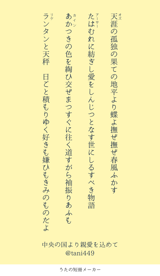 tani449☆quiet followDOODLE「賢者の魔法使いより親愛を込めて」予防接種の副反応で39度の熱を出しながら親愛ストーリーを全員分読み返し21人1首ずつつくった短歌 #まほやく短歌 show all(+4 images) Tap to full screen (size:550x950).Repost is prohibited Let's send reactions! freqpopularsnackothersPayment processing Replies from the creator Follow creator you care about!☆quiet follow tani449DONEスポットメインエピソードを読んでつくった短歌21首 5 tani449DONE独断と偏見による「短歌に詠み込みやすい呪文ランキング」掲載の呪文をそれぞれ詠み込んだ短歌たち。1位から23位まで順番に並んでいます。※ポッシデオのみ折句 28 tani449MEMO谷の短歌メモ 2 tani449DOODLE「賢者の魔法使いより親愛を込めて」予防接種の副反応で39度の熱を出しながら親愛ストーリーを全員分読み返し21人1首ずつつくった短歌 5 tani449DONEパラロイWEBオンリーイベント「SEE THE WORLD」展示短歌連作「Speak Low」 5 related works ps1000springDONEオーロラと夜明けのワルツ5おめでとうございます!新作短歌数首を掲載します。 3 tani449DOODLE「賢者の魔法使いより親愛を込めて」予防接種の副反応で39度の熱を出しながら親愛ストーリーを全員分読み返し21人1首ずつつくった短歌 5 ps1000springDONEオーロラと夜明けのワルツ3.5開催おめでとうございます!5月に頒布したアサオズ短歌集「すべてあなたの冬の庭」より未公開分より12首、新作12首を展示します。 6 ps1000springDONEオーロラと夜明けのワルツ4開催おめでとうございます!新作短歌「連作 彼方の日々へ」と、極光祈る犬使いのバラッドの連作を公開します。パスワードはピクリエ内のお品書きを参照下さい。 7 recommended works TakjeuebxDOODLE舟德莱 ps1000springDONEオーロラと夜明けのワルツ3.5開催おめでとうございます!5月に頒布したアサオズ短歌集「すべてあなたの冬の庭」より未公開分より12首、新作12首を展示します。 6 ps1000springDONEオーロラと夜明けのワルツ4開催おめでとうございます!新作短歌「連作 彼方の日々へ」と、極光祈る犬使いのバラッドの連作を公開します。パスワードはピクリエ内のお品書きを参照下さい。 7 ps1000springDONEオーロラと夜明けのワルツ5おめでとうございます!新作短歌数首を掲載します。 3 HowlINFOc105、参加。1日目【コ-57b】2日目【え-16b】宮﨑駿と鈴木敏夫の81禁創作BLR-81G(ギャグ)です。新刊は「スーさんと巨匠のアニメバカ日誌4 温泉宿でドッキリ♡同衾!?ポロリもあるヨ!」28pです。アラカーさんのNHKドキュメンタリービデオ(アラカービデオ、略してAV)の内容多めです。ポロリもあるよ!(メイ本当に見たもん!嘘じゃないもん!本当にポロリしてたんだもん! 2 rechan706DOODLEレプ葬げんみ❌のらくがき怪盗秘匿持ちは⭕️ 3 某牙KamsaraSPUR ME·ファン×ビルダー(ビルダー性別不指定)&ミント×ビルダー♂|二人称|ファン誕生日祝SP|中訳日·ローガンとある定年退職したビルダーの約束、そしてミントのプロポーズ回です! 22035 1341flammaeDOODLE己の中の都合のいいぽんぽこをかき消すコーサカ さとぴあDOODLE2001年12月26日のしぃお絵かき掲示板設置から23周年を迎えました。https://paintbbs.sakura.ne.jp/oeb/cgi/petit/?resno=2914その2001年12月26日の投稿↓https://paintbbs.sakura.ne.jp/pastlog/poti/bbsnote7/potiboard.php?res=1#お絵かき掲示板