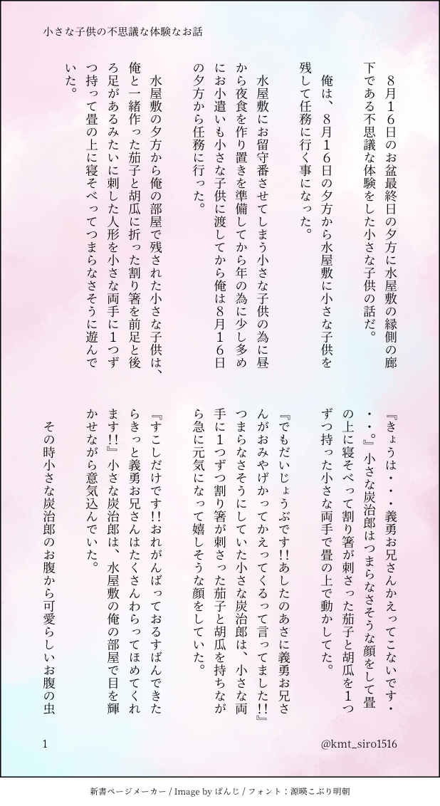 お盆の日に、水屋敷で小さな炭治郎くんは水屋敷に1人でお留守番になってしまいました。