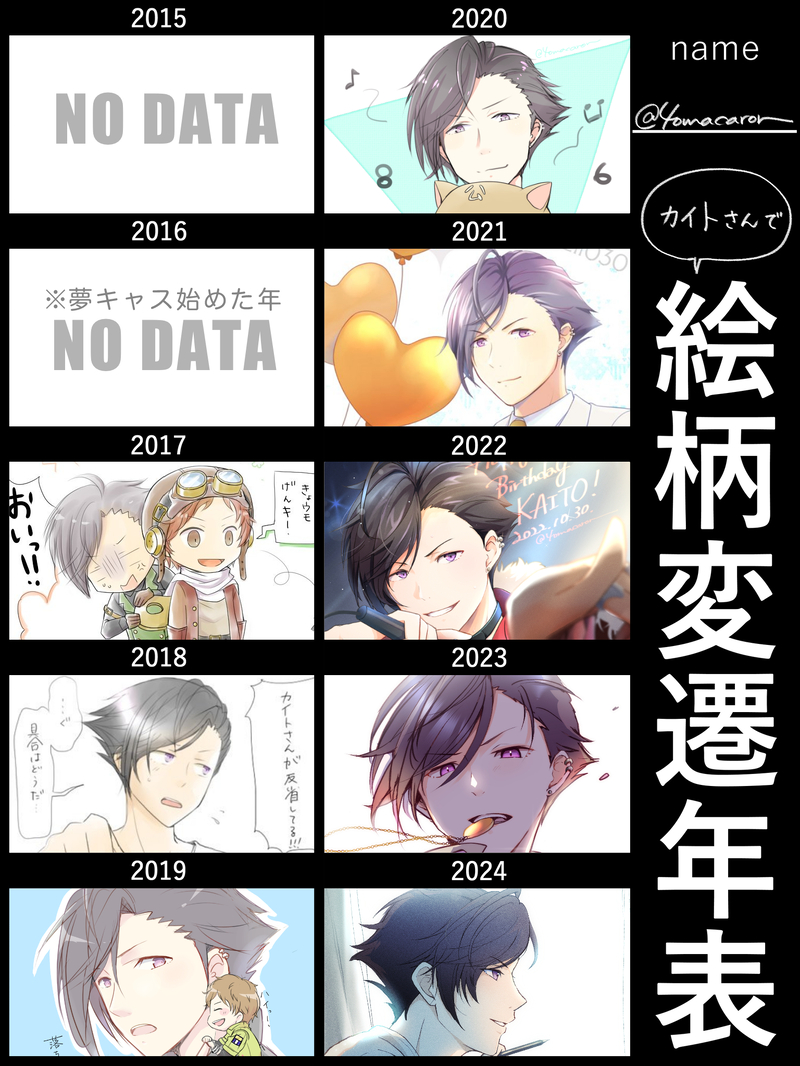 カイトNo.40で触れた謎の前髪とおでこの空間も、2020年くらいまで確認できますね。いつも過去絵との比較は昴くんでやるので、カイトさんは初かも。古くなればなるほどカイトさん単体を探すのが困難、だけどテンプレ使う以上は他の方の目に入ることも想定してのチョイスです。2018は夢ミュのレポ。