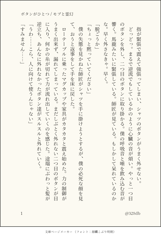 328db☆quiet followDONEボタンがひとつモブ霊初めての夜、緊張MAXのモブくん #モブ霊 MobRei ##モブ霊 show all(+1 images) Tap to full screen (size:630x928).Repost is prohibited Let's send reactions! freqpopularsnackothersPayment processing Replies from the creator Follow creator you care about!☆quiet follow 328dbDONE兵皆SS詰め2025/02/22〜ぜっちるwebオンリーイベント『白紙の未来』のその先へ!4th、開催おめでとうございます! 3 328dbDONE(モブ)霊とエクボ霊幻がクソ男でエクボがかわいそう。阿部定事件見てたら書きたくなった。しげお、ごめんね。 1004 328dbDONE感染対策はしてこいよzoomセックスするモブ霊シテイシティ一周年のお題企画そのいちzoomセックスってセックスなのか!? と思いながら書いてましためちゃ楽しかったです〜! ありがとうございます💐結局最後までできなかった……! 3497 328dbDONE猫耳モブ霊(偽)SINK, SLOW, DOWN初版の通販時に同封したペーパーを手直ししました。シテイシティさん、一周年おめでとうございます!!!! 2300 328dbDONEたわむれモブと隆子タイトル通り。ちょいすけべ。 328dbDONE梯子モブと隆子(♀霊)すけべ一歩手前 2 related works ewo6_6ewoDOODLEカップルリバーシについて見解を深めたらくがき kuchiasobiDOODLEモブ霊(成人かな?) kuchiasobiDOODLE【モブ霊】なんで飲めないのに連れてってくれたんですか 3 SairleBDOODLEOmega Reigen in heat (or something). km__222DOODLEモブ霊(霊ばっかり)エロ落書き詰め⚠︎年齢操作なんでもありですpass→18才以上ですか?(yes,no) 2 humi0312DONEシテイシティⅡ春祭り開催おめでとうございます!四月と桜にまつわる師弟からモブ霊になる1125→1327→1529→2337→5871の二人の話です。パスワードは師弟の日です(4ケタ)!「お前と見るのが良いんだからさ」 5909 nyagwam1219DOODLE1125モブ霊風呂の日と聞いていても立ってもいられなかった humi0312MOURNINGこれはできたら本にしたい……。まだ子どものモブくんと、師匠からモブくんを好きになる話。 2651 humi0312DONE2236、社会人になって新生活を始めたモブくんが、師匠と通話する話。cp感薄めだけれどモブ霊のつもりで書いています。シテイシティさんのお題作品です。故郷は、 1305 recommended works of_kururiyaGKDOODLEその感情に蓋をした/杉尾原作軸モブレ未遂を助けた、自分を大事にして欲しい杉と自身に無頓着な尾の話(恋人未満)露骨な表現はありませんが会話内容が背後注意かも⚠️ モブ尾未遂 6 雨うさぎMEMO思いついたはいいけど、CPがエク霊なのか影山サンドなのかよくわからん&倫理観ゼロの世界観などpixivに上げるには難ありと判断し没になったネタです。殺伐したハードボイルドもよきかな…🤤軍人パロにマフィアパロ合体してみた 3090 km__222REHABILIモブ霊(というより霊)エロ絵練習🏋️パスワード:成人済みですか?(yes?no?) くまだMAIKINGモと、まだ素直になりきれないレが致している話です。急に終わります。年齢設定考えてないけど、基本モくんが成人済みの話ばっかり妄想してるので、多分このモくんも成人してる。 831 まつりDONE※1731くらい※モ君が変顔をしているのでご注意くださいパスワードはJMR3開催日(4桁)です 12 DNFyDysDOODLE mfDONEモブ霊 卒業(16p)テキスト→ https://notes.underxheaven.com/preview/332d3b9e8e20d68f3481f88da080df1f 16 masu_oekaki8810DONE中パンさんのお誕生日だそう。「エッチなモブ霊」をご所望されてたので書いてみた…が、やはり挿入までいかず。モブ霊なのかも怪しいとこですが…茂夫は成人済みの設定です。 1419 nlnlymMOURNINGたんぎゆの別れ話(R18)※アンソロへの寄稿作です 13486