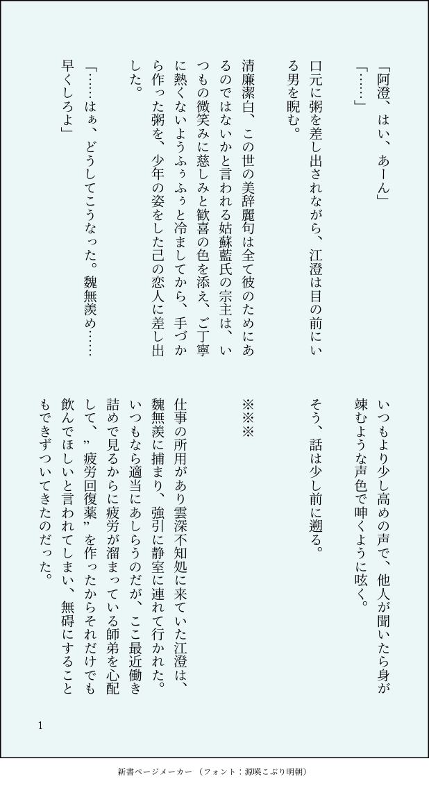 ruuuuuuumion☆quiet followDONE曦澄ワンドロワンライお題「看病」その1 #曦澄 #魔道祖師 GrandmasterOfDemonicCultivation show all(+5 images) Tap to full screen (size:618x1132).Repost is prohibited Let's send reactions! freqpopularsnackothersPayment processing Replies from the creator Follow creator you care about!☆quiet follow ruuuuuuumionDONE曦澄ワンドロワンライお題「盛夏」 6 ruuuuuuumionDONE曦澄ワンドロワンライお題「雨」 6 ruuuuuuumionDONE忘羨ワンドロワンライお題「待ちぼうけ」 3 ruuuuuuumionDONE忘羨ワンドロワンライお題「夢」 3 ruuuuuuumionDONE曦澄ワンドロワンライお題「看病」その2その1の間の出来事です 3 ruuuuuuumionDONE曦澄ワンドロワンライお題「看病」その1 6 related works 西村ルルMOURNING書けないから供養。長い設定つき。現代AU、男子校パロ。魏嬰が藍湛の🍆を口にする描写があるので、R18にしています。乳首触ったとこから進まず、途中放棄してしまいました😂 1804 ごーるDOODLE待ちぼうけ⚠︎Attention⚠︎全て個人の妄想によるフィクションです。実在の人物・団体・事象とは一切関係ございません。無断の転載を固くお断りします。It's all an individual fantasy fiction. 藍湛の悪夢。ハピエンです!!阿令設定ですがまどそしでも。痛いほどに、愛しく思う。 9 emi_smile_m__mMAIKING初投稿。 九夏BOXPAST毎日一緒に寝てくれるんだろ? はゆやSPUR MEオメガバース忘羨匂わせ程度のすけべな描写あり設定はこちらhttps://twitter.com/soushokukoebi/status/1483004515385507840?s=21 2605 やっすーTRAINING魔道祖師の魏嬰ちゃんです! とさみくMAIKING kd1ty4_ko_2MAIKINGNLでも描いたことなかった肌色系、描いてみたいと思わせる魔道祖師(忘羨)、恐るべし笑完成するかどうかは不明😂 伊東しんDOODLE魏嬰と金凌が凄く好みです recommended works きゆこMOURNING魔道祖師の莫玄羽くん(金時代)講義中に描いてた幸せになって欲しかった… とさみくMOURNINGエイプリルフールネタ 4 hiomumu_00DOODLEショタ化してます 2 yomogi_ktDOODLE藍曦臣が白兎になる話その後。正体がバレた後のうさ曦臣と江澄の逢瀬です。 8 yk0__wDONE交流会5で展示していた現代AU曦澄のハロウィン漫画です👻澄の攻め力がやや強めですが曦澄です💙💜 4 しばた三歳DONE【含光君の恋文】#2cql第54話「はじめての添い寝」(妄想)ドラマでは共寝表現が無かったのでお初という事に。【注意】・藍湛を手助けするモブがおります・藍湛の勃〇表現あり・まだ知己ですが、そのうちR-18に突入いたします・単体でも読めます・アニメ/原作/cql履修済・設定捏造してます、ふわっとお読みください 10707 mipalnieDONE古代AU/cuntboy!鯉注意⚠️惡鬼!尾×小狐狸!鯉👹🦊之前漫畫的後續,發情期被騙到娼館去賣身的小狐狸,遇到了來此處消遣的尾。因店家給小狐狸貼了符咒,導致他無法逃跑,只得討好尾,求尾帶自己走…💕 3 izusonneDOODLE10月10日は天天の日。 2 天子(てんこ)DONE忘羨/曦澄某映画の某曲が忘羨すぎて御剣デートさせたくなってしまった江澄の恋路がメインっぽさありますが、メインは御剣デート忘羨です後日、曦澄side予定※誤字脱字その他ミスがある可能性大※ 6069