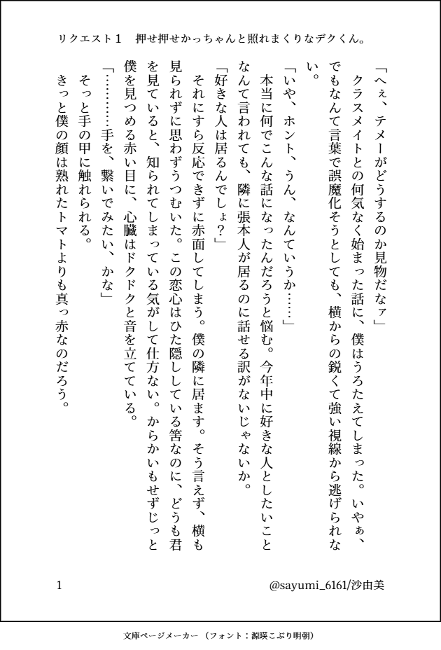 sayumi_6161☆quiet followDONEココデサンバにてリクエスト頂いたSSです。全て横読み(小説の一番頭文字を左から右に読む)付きです。構って頂きありがとうございました!一:押せ押せかっちゃんと照れまくりなデクくん二:うっかり好きと言ってしまう雄英出勝三:ドライブする出勝 #出勝 izukatsu #ココデサンバ #小説 novel show all(+6 images) Tap to full screen (size:630x928).Repost is prohibited Let's send reactions! freqpopularsnackothersPayment processing Replies from the creator Follow creator you care about!☆quiet follow sayumi_6161DONEココで勝誕!!にてリクエスト頂いたSSです。すべて横読み(小説の一番頭文字を左から右に読む)付きです。構って頂きありがとうございました!!一:「葉桜」と「桜餅」二:今日の🍚シリーズの二人で、あーんをしあう2人の甘いお話 4 sayumi_6161DONEココデサンバにてリクエスト頂いたSSです。全て横読み(小説の一番頭文字を左から右に読む)付きです。構って頂きありがとうございました!一:押せ押せかっちゃんと照れまくりなデクくん二:うっかり好きと言ってしまう雄英出勝三:ドライブする出勝 7 sayumi_6161DONEココデカツでリクエスト頂いたSSです。全て頭文字を左から右に読めるようにしています。ありがとうございました!一:先生×プロヒの出勝で手っくす二:雄i英初期の出勝で「あつい」三:「好きって言うな」で出勝四:二人でご飯を作る出勝五:仕事から帰ったらリビングで寝落ちていた出くんとそれに対する勝ちゃんの反応で出勝六:ふとした瞬間に脳裏によぎる緑色の閃光にイラつく勝ちゃんで悲しみを覚えるの出勝 6 sayumi_6161TRAINING萌を本当にありがとうの気持ちを込めて😌出勝ではるか未来捏造の小説です。パス:R18? 7 related works sayumi_6161DONEココデサンバにてリクエスト頂いたSSです。全て横読み(小説の一番頭文字を左から右に読む)付きです。構って頂きありがとうございました!一:押せ押せかっちゃんと照れまくりなデクくん二:うっかり好きと言ってしまう雄英出勝三:ドライブする出勝 7 recommended works Eugk_kDONEあさひちゃんがすぐどっか行っちゃうのって話を柳さんにしているだけの小話(?) ⋆. 𐙚 ˚DOODLE エモ山DOODLEhrakまとめ右爆左出ごちゃまぜ出茶もあるよ 27 Sasa_xxx0812PROGRESS【月尾】現パロ同棲してる二人の朝1.2が尾形さんの独白、3.4が月島さんの独白になります。今回載せた話の続きと【🦉 @P_owl296 】さんの、三月に出される月尾本と繋がる短編二つを綴らせて頂く事になりました。拙い文書になりますがよろしくお願い致します! 4 わ縞 wajimaDONE主ニルお髭の話ステディな関係 4 tororoDOODLE緊縛(もどき)出勝 (細かいところは気にしないで欲しい) konoha_reireiDOODLE serize7b2DONE⚠️BL/アンセフィ小説【あらすじ】全年齢向け『だって同じものを使ったから』の続きです。後輩のカにセと付き合っていることがバレたアは── 雰囲気……微ギャグ 微甘おまけ程度で一瞬で終わらせるつもりだったけど、おまけじゃなくなってしまった。(短文と言えば短文なんだけど)私はあの例の公式の少年期美麗絵で相当脳を狂わされたらしい。※web初出…2024年5月30日 7 おこめDOODLE📿︎︎ ♀いちくだったり、ほかの人もいたりする 12