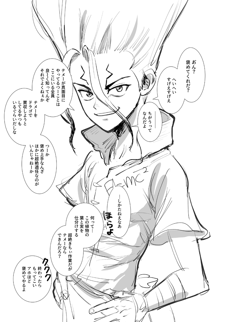 私もあの千空は結構気に入っております。舞台は宝島編なのですがソユーズから出てきたプラチナをみて百夜がいないことを再確認してしまい、おセンチになっちゃう千空いいですよね…。