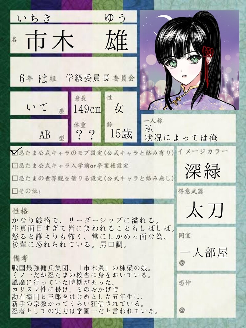 いおん。☆quiet followDONEうちの子達!!! #オリ忍 oriNinja show all(+9 images) Tap to full screen (size:1080x1440).Repost is prohibited Let's send reactions! freqpopularsnackothersPayment processing Replies from the creator Follow creator you care about!☆quiet follow いおん。DONEうちの子達!!! 10 related works pssm__09DONE※オリ忍五年は組 大葉千義(おおばゆきよし)2/25生まれのうお座のO型。一人称「私」委員会未所属。呼ばれれば助っ人に行く。五車の術が得意。本気を出せば人の心を操れる恐ろしい子。※人様のオリ忍もいます。https://x.com/pssm__09/status/1758012282154704914?s=46&t=q1uKXkNziDRVl1uSZIZxmQ 25 pssm__09DONE※オリ忍三年い組 梅ノ木 灯汰(うめのき とうた)151cm。一人称「僕」委員会未所属。いつか植物委員会を作りたい。見た目は美少年 言動は狂人。笑えば周りに花が咲く程の美人だが基本 無表情。※人様のオリ忍もいます。 14 A__rata__06DOODLE 巴椒(hasho)DOODLEらくがき帳参ログ②(100均のアルコールマーカーでアレコレしたログ)オリジナル忍♂の夢要素満載です!一枚目の内容を含んだり含まなかったりします!オリ忍 / 男主 / 夢絵 13 pssm__09DONE※オリ忍六年生。 和左尾 つき代(わさび つきよ)168cm。一人称「私」保健委員会所属。 兄2人弟1人の4人兄弟。元々は前線で戦うのが得意だったが体力の限界を感じ苦無では皆を守れないけど包帯でなら守れると、医療の道を目指し始め医者見習い中。常識人でみんなママハキハキしてるので女性に好まれる女性。※人様のオリ忍もいます。 7 巴椒(hasho)DOODLEらくがき帳参ログ①(ペンとベタ入れたら髪型に悩みだしてしまったログ)オリジナル忍♂の夢要素満載です!一枚目の内容を含んだり含まなかったりします!オリ忍 / 男主 / 夢絵 25 巴椒(hasho)DOODLEらくがき帳壱ログ②オリジナル忍♂の夢要素満載です!一枚目の内容を含んだり含まなかったりします!オリ忍 / 男主 / 夢絵 /夢漫画 19 巴椒(hasho)DOODLEらくがき帳弐ログ②オリジナル忍♂の夢要素満載です!一枚目の内容を含んだり含まなかったりします! オリ忍 / 男主 / 夢絵 / 夢漫画 18 pssm__09DONE※オリ忍鍵垢用のオリ忍。戦闘狂欠損じじぃと可哀想な子。 6