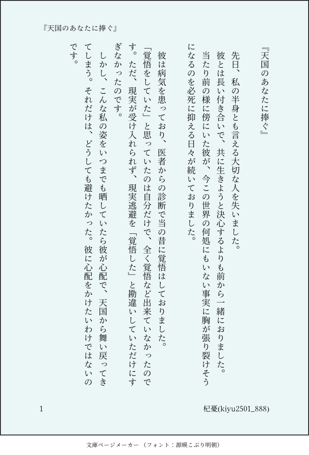 kiyu2501_888☆quiet followDOODLE🐯🌸『天国のあなたに捧ぐ』薫より先に虎次郎が死に、天国にいる虎次郎へ捧ぐエッセイのようなものとして書きました。元ネタはぼぶさん( @chochikuyou )のツイートです。!!!注意!!!・死ネタ問題ない方だけお読みください。 show all(+6 images) Tap to full screen (size:630x928).Repost is prohibited Let's send reactions! freqpopularsnackothersPayment processing Replies from the creator Follow creator you care about!☆quiet follow kiyu2501_888DONE🐯🌸『紙切れ一枚の愛』入院することになった薫のために虎次郎がとった行動とは……。ジョチェ。!!注意!!薫死ネタ 3683 kiyu2501_888DONE虎次郎の誕生日話。願い事を書いた7つの短冊は、果たして叶うのだろうか。ジョーチェリ🐯🌸ほのぼの、イチャイチャ7/17 サマコレ展示作品 22 kiyu2501_888DONE薫の誕生日のお話。忍者チェリーブロッサムは三人の使者からお宝を受け取るって本部に戻るミッションを与えらた。ジョーチェリ🐯🌸ほのぼの7/17サマコレ展示作品 10411 kiyu2501_888DOODLEデザワ🐯短髪🌸のやってる最中の話。クズというか、ヤンデレみたいな感じになってしまった…。なんでも許せる方だけどうそ。やってる最中ですか、大したことないです…。私にエロは無理なのだ…。!!注意!!・若干の首絞め・スパンキング・デザワ🐯がちょっとクズ 2143 kiyu2501_888DOODLE🐯🌸『月が綺麗だったあの頃に』デザワ30南城とデザワ30桜屋敷のネタ。禁煙南城を書こうと思ったはずが、闇落ち南城になってしまいました。何故…。デザワネタなのと、ちょっと暗い話なので無理そうならば、お戻り下さい。!!!注意!!!・闇落ち南城 4 kiyu2501_888DOODLE🐯🌸『天国のあなたに捧ぐ』薫より先に虎次郎が死に、天国にいる虎次郎へ捧ぐエッセイのようなものとして書きました。元ネタはぼぶさん( @chochikuyou )のツイートです。!!!注意!!!・死ネタ問題ない方だけお読みください。 7