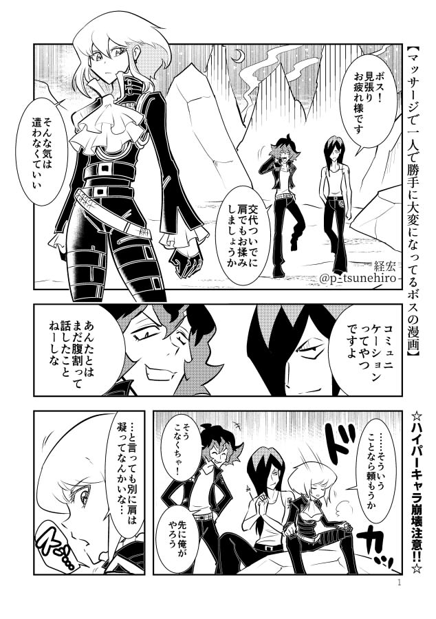 まだ出会ったばかりの三人が肩もみマッサージでコミュニケーションを図るけどボスが一人で勝手に大変なことになってるやつです。マジでなんでも許せる方向けです。