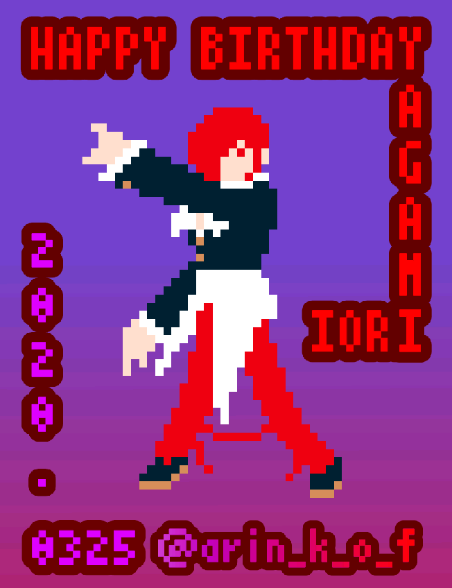 ありん☆quiet followPAST庵んのお誕生日ドット絵2020。KOF97の公式立ち絵をぽちぽち描いてお祝いしました🎂 #KOF #八神庵 hermitage Tap to full screen (size:652x848).Repost is prohibited Let's send reactions! freqpopularsnackothersPayment processing Replies from the creator Follow creator you care about!☆quiet follow ありんDONE2020年の京のお誕生日イラストでした。1日ワンシーンずつポチポチ描くのが楽しかった。KOF15の京にバンダナが復活したので、せっかくならと94〜98からそれぞれ選んでみた。おめでとう🎉 ありんPAST庵んのお誕生日ドット絵2020。KOF97の公式立ち絵をぽちぽち描いてお祝いしました🎂 ありんPAST以前作った庵んの鬼焼きのアイロンビーズを元にドット絵にした。それを更に改変して14スタイルに。 ありんPAST(…は…はやい……!)KOF2000のエンディングのセスさんが好きすぎて描いちゃったやつ。可愛くそれっぽく出来た…と思う…! ありんPAST2019年のお誕生日絵でした。何を描こうか悩んだけど、原点に戻って「燃えたろ?」のポーズを。服の色味は94のドットを見ながらチョイス。KOF25周年だったし、ちょうど良かったかな。 ありんPASTKOF2001のお気に入りのデモ画面。「独りで何が出来る?」ってK9999が怒りに表情を強張らせてるクーラちゃんへ言い放った後に、「…2人だ」ってK′が暗闇からおもむろに登場するのが最高に熱くてクールで大好きなシーン。 related works rakuruishivaPROGRESSⅩⅣの庵 たこお2号機DONE庵子さんにひどいことをしてしまった……… なと🐈PAST旧垢で描いた過去絵です🌙☀🔥ほぼ鉛筆アナログ画。 18 たこお2号機DONE八神にくべんき(四肢欠損)そこまで痛そうではない+汁とかもでてない…のですが一応R18+R18G 4 rakuruishivaDONEⅩⅣ庵やっとできた〜🙌 tamako2444625PAST昔描いた燃え太郎+@。スミノヒルネさんの絵にもろ影響を受けてました。 rakuruishivaPROGRESSⅩⅣ庵進捗…線画は終わった…はず←全身の予定… たこお2号機DONE爆乳のぶりおりです 2 あわわDONE15の予約ちゃんとしましたよ八神さん!😌🙏✨✨色塗りめんどくさーってなったのに結局塗ってしまった💦練習練習!!柄は無理だった💦 recommended works 行けたら行くわPAST 6 uniDONE Do not Repost・東龍TRAINING天ぷら。 2 Do not Repost・東龍DONE◆Kさん喋った(感涙)→https://youtu.be/za7diwrDg1c◆で、調子こいて静止画でもう1個→https://youtu.be/tx4ahlrE4r8◆で、調子こいて某アニソン歌わせました(何歌ってんのかわかったら凄い)→https://youtu.be/pdM_4FfTTl0 にぼしDONE無限列車編楽しみ suminohudeDOODLE パプリカDONEばれんたいんでーきっす2020.2.14 2 9u8TRAININGとりあえず、ここまでやった…… monaperonDONEぷにみねゆかり