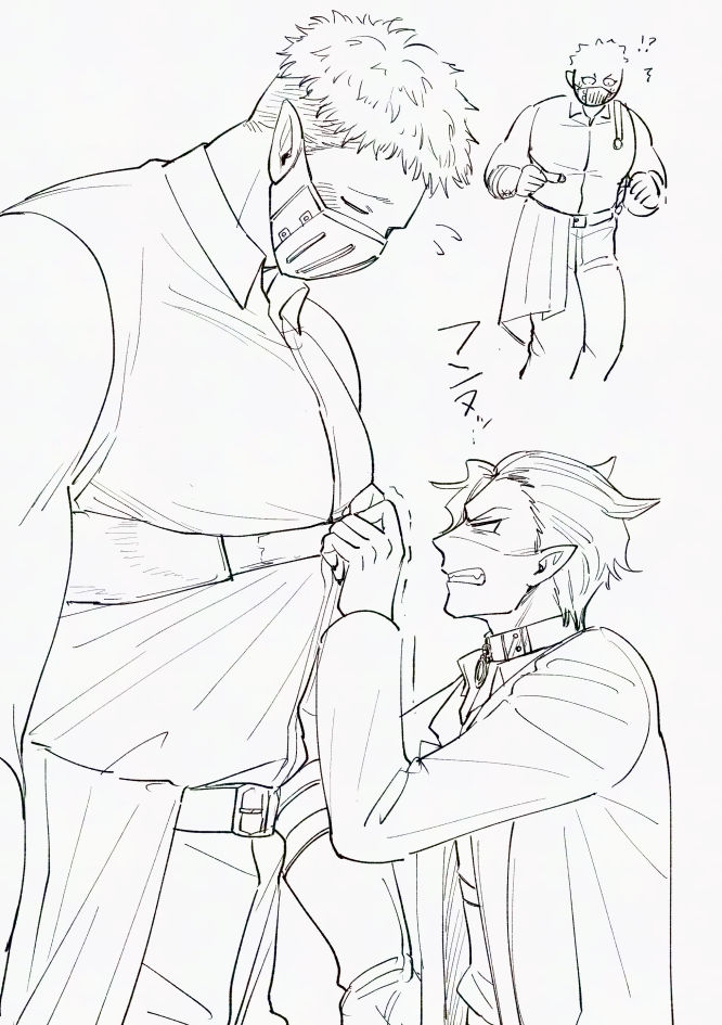 フォロワーさんの、コラボのシチロは豊満すぎてベルトが足りなかった説に大変納得してらくがきさせていただいたタワ💿コラボ妄想☺ベルトが締まらないロウ