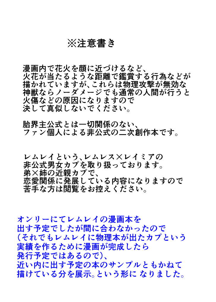 オンリーにてレムレイ本を出す予定でしたが間に合わなかったので、いつか出す本のサンプルともかねて描けている分を展示。という形に なりました。