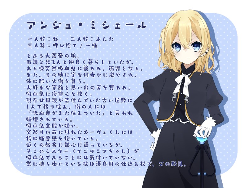 こなつ☆quiet followDONE吸血鬼ものがたり(https://shindanmaker.com/588596)の診断結果から生まれた子 #創作 creation #吸血鬼ものがたり vampireStory Tap to full screen (size:1900x1447).Repost is prohibited Let's send reactions! freqpopularsnackothersPayment processing Replies from the creator Follow creator you care about!☆quiet follow こなつPASTもう何をあげてないか分かってない 18 こなつPASTよその子しかいない 10 こなつPAST2020年暮〜最近まで 23 こなつMEMO刀神、CONF他 17 こなつDOODLEミリシタで水中キャンディ実装が嬉しすぎてこのみさん初描き。コミュも泣いてしまった……。曲名カード楽しみ☺️☺️ こなつMEMO5人分CS他 24 related works こなつDONE吸血鬼ものがたり(https://shindanmaker.com/588596)の診断結果から生まれた子 sonchou_BLKMEMO人間種の女の子です#吸血鬼ものがたり 3 sonchou_BLKMEMO貴族の吸血鬼、ルーヴェ夫人ルーヴェ将軍の奥様で、留守がちの夫に代わり家を切盛りし、警備部隊の指揮をとる女主人。可愛い女の子が好きで、行く宛の無い女子を見つけては拾い家で面倒を見てしまう癖がある。#吸血鬼ものがたり 2 sonchou_BLKMEMOかつて1度キャラデザ作った子をリメイク。吸血鬼のチャオ・チュールくん。#吸血鬼ものがたり 2 sonchou_BLKMEMOマルグリット・スカーレットちゃん闇に紛れて現れる暗殺者業の吸血鬼さん。めっちゃ強い(パワー!)#吸血鬼ものがたり 3 recommended works 渡辺こよ(akuta)PROGRESS4ページ折り本用 碧唯/あおいMOURNINGパースミスったので供養 みらくるおるるDONE昨日の絵塗りました。ものすごい光る椅子に座る人。 いさかわDOODLE巡礼者 ほたぴDONEおばんのめんへらいらすとれーしょん 2 瀬@色々描くDONE尊敬する絵師様のアドバイスを読んで描いてみたもの。 ひとばDOODLE着せ替えペトルーシュカ るんるんるんDONE 2 EzMwPIC6w4k4zc5DOODLE 2