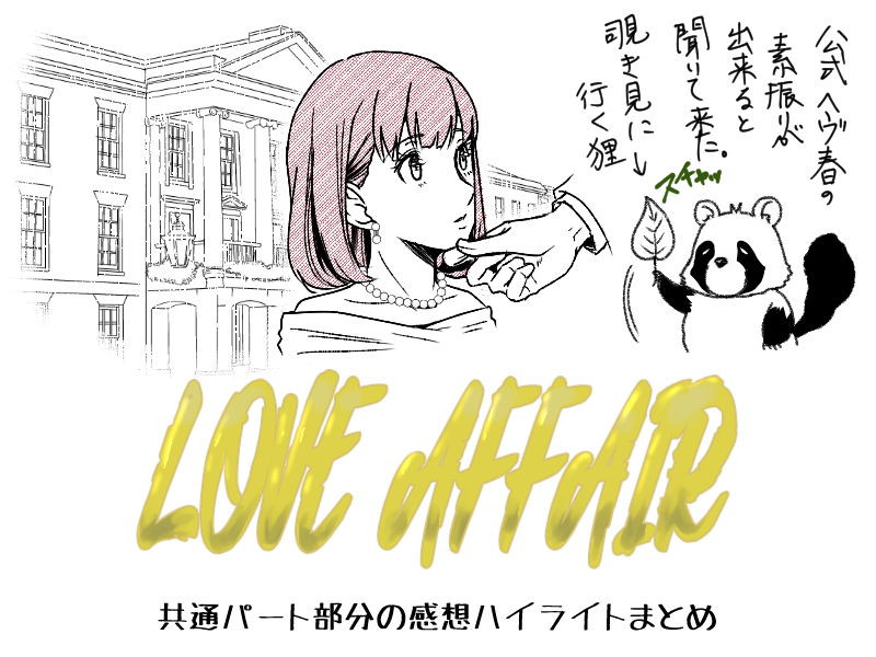 今更ですがLOVE AFFAIRの感想をまとめました。携帯のメモからそのまんま起こした内容なので取っ散らかっています。ひとまず共通パート部分のみ。個別については別にまとめます。