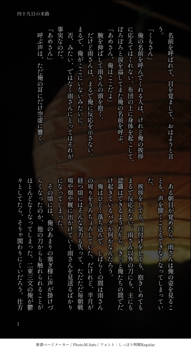 tou3n☆quiet followDONEさみくも。ハッピーバッドエンド。話の展開上、地雷には配慮していません。すけべではないですが背後は注意。 #さみくも basketFish show all(+6 images) Tap to full screen (size:618x1132).Repost is prohibited Let's send reactions! freqpopularsnackothersPayment processing Replies from the creator Follow creator you care about!☆quiet follow tou3nPROGRESSおわらない 1980 tou3nPROGRESSべがの新刊の原稿進捗書きっぱなしなので誤字脱字があります 1597 tou3nPROGRESS現パロの車中えっち※良い子は運転手に手を出してはいけません。危険運転です。 565 tou3nPROGRESS現パロのネタ出し 327 tou3nPROGRESSVEGAの小話の冒頭(の下書き) 498 tou3nPROGRESSVEGAの本の下書き 3188 related works kanaDOODLEよくある後天性女体化さみくも♀さみは鋼の理性で耐えたけど、誤解が解けた後は存分にワンワン🐾してるはず kusakabeeeee_DOODLE【さみくも】お腹痛くなっちゃった☁️のお腹をさすってたらなんか盛り上がっちゃった☔️☁️ 北極星のなりそこないDOODLEげんけの(さみくもの姿)落書きSS。なんか現八が町娘にチヤホヤされてるって聞いてムカついた毛野さんの話。 3002 tou3nDOODLEお題箱から。☁️さんの初めてみる姿にどうしようもなくなっちゃう☔️さん。 3 北極星のなりそこないDOODLEげんけの(さみくもの姿)SS。「似合う色(https://poipiku.com/1224139/8206266.html)」の続きというか夜の話。えっちしてるだけです。乳首責めとかドライとか攻めの自慰とか。 3814 amekumohurehureDONE激しい雨に共鳴しちゃった☔さんと翻弄される☁️くんのR18さみくもです😌※あなたは18歳以上(高校卒業済)ですか? 8 kanaCAN’T MAKE互いの好きな色を思い出に残すさみくもと、何かを察したまついスマホが一振りにつき一台支給されている本丸 2 kanaDOODLE付き合ってないさみくも(現パロ風味)付き合ってなくても多分出会った時からお互いに好きだったやつだけど、雨さんモテるから俺なんか…ってくもちゃんはずっと気持ちを隠してた(しかしさみは最初からくもちゃんしか見てなかった) 2 kanaDOODLEさみくもちゃんは早く帰りたい 2 recommended works にたおあDOODLEさみくも 肉まん 半分こして nogoodu_uDOODLE命ふたつ(さみくも)さみ→くも所感。花見ボイスの話です 晩春の雨は細かく、霧に近い。村雲は今日も、腹痛を訴えてしくしく泣いている。「雲さん、大丈夫ですか」「うん」 五月雨の膝に突っ伏す背を撫でていた手を髪に通すと、心地良さげに息を吐く。無理をしているわけではないようだ。 開け放った窓の外に、もうほとんど散りかけの桜が見えた。わずかに残った花も雨に落とされつつあり、それが彼の顔色の青白さと重なる。 本丸で花見の宴が開かれた時のことだ。誰かが顕現して間もない村雲の髪を指して、桜の色だと言った。それを聞いて五月雨は、逆ではないかと思ったのだった。 五月雨は人の身を得てからは冬しか知らず、春が来るよりも先に村雲を迎えた。だから五月雨にとっては、村雲が桜の色なのではなくて、桜が村雲の色なのだ。そのことを自覚して以来、桜を見るとなんとなく、村雲を思い出してしまう。 五月雨は俳家で、忍びで、犬であるから、神も仏もなくただ生きている。それでも村雲江という刀を見ていると、生とは苦しみであることを強く意識する。 以前もこんなふうに村雲を介抱してやりながら、五月雨は苦しむ村雲を見かねて思わず、どうしてこんなところに来たのかと訊いたこと 1788 粕漬メロ子DONE時々、本丸の隅っこで見かける風景。2枚目は描いてる途中のもの。紫陽花っぽくて気に入っているのでいっしょに載せておきます。 2 rio6040DOODLEさみくもの授乳手コキのようなそうでないような。元々違う目的で雨さんの体描いてたんですけど、あのスケベインナー着せた瞬間授乳手コキしか浮かびませんでした。雄っぱいは雨さんの方が豊か説を推します。分かりにくいですが2枚目の右上で扱かれてるのは雨さんの雨さん、3枚目で扱かれてるのは雲さんの雲さんです。雲さんにょたの方の授乳手コキも後日上げたい。 3 7nC7exDiSUsR5N4DONEこの前上げた松井君提案エチエチゲームの開始の話し。さみくも、くわまつ前提百合♂な内容。ポイピク君生き返ったから此方でも上げます😊 8 7nC7exDiSUsR5N4DONE前に描いたにょた🌧のひたすらいちゃいちゃバージョンです。修正抜けてるページあったので上げ直しです(´;ω;`) 11 rosut_82DONE伏釘のクリスマス。ずっと欲しかったアクセサリーを🎁してもらって嬉しすぎてずっと眺めてる野薔薇ちゃんとそろそろ構ってほしくて指に触れる伏黒。なんとなく薬指に触れてる時間長くなってほしい。伏黒側にある🎁は、野薔薇ちゃんから。誕プレとクリスマス用(誕生日に会えなかったので) 3 nogoodu_uDOODLE犬の村雲と犬萌えの雨さん 2 7nC7exDiSUsR5N4DONEさみくも姫初めとその後です。ブツの描き込みは無いですが二枚目は合体してるのでワンクッション 2