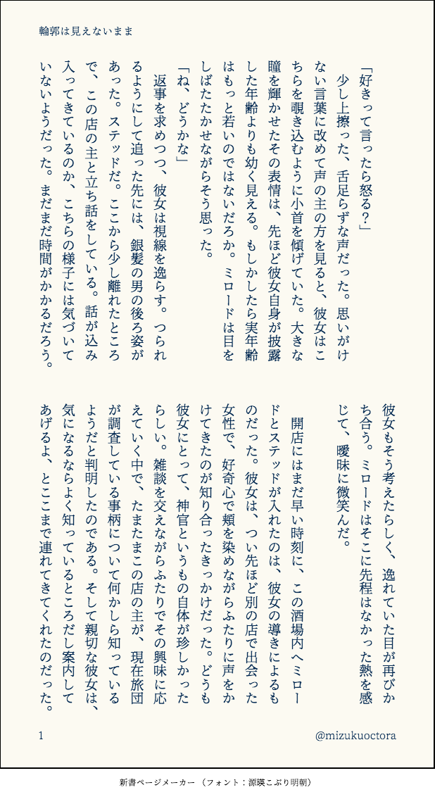 瑞久倉庫☆quiet followDONE『輪郭は見えないまま』モブっ娘に恋バナを相談されるミロードの話。※当社比CP色?強めかもしれません。 ステッドに無自覚片想い?しているミロードがメインです※モブっ娘がよく喋ります※特に触れませんが、権授一章後想定です2024/6/11(X投稿)2024/7/11(ポイピク格納) #オクトラ大陸の覇者 ##文章もの show all(+7 images) Tap to full screen (size:618x1132).Repost is prohibited Let's send reactions! freqpopularsnackothersPayment processing Replies from the creator Follow creator you care about!☆quiet follow 瑞久倉庫PAST粘土ミロードの写真まとめです。主に季節の花々と一緒に撮ったものになります。時々増える予定。桜&造花桜(10枚)→チューリップやネモフィラ等(6枚)→アジサイ(1枚)→蓮(6枚)→ひまわり(4枚)→彼岸花(2枚)2025/9/27更新 29 瑞久倉庫PASTミロードの秘奥&必殺上限開放記念天降る光、綺麗だなと思いながらいつも使ってます2025/6/19(x投稿) 瑞久倉庫PAST診断メーカーより、お題『停電の夜』で140字SS※ミロード→ステッドっぽい話※2枚目は診断結果2025/6/16(x投稿) 2 瑞久倉庫PAST診断メーカーより、お題『ただいま妄想中』で140字SS。※ステッドとミロードで現パロ※ステ目線のほのぼの※2枚目は診断結果2025/6/14(x投稿) 2 瑞久倉庫PASTCV繋がりで衣装交換!搦め手多そうな剣士と物攻高そうな神官になりました。2025/5/19(x投稿) 2 瑞久倉庫PAST笑顔が描きたくて一枚目:ミロード(頬が緩むるのが抑えきれない)の笑み二枚目:ステッド(からかい半分、気の緩み半分)の笑み2025/5/17(x投稿) 2 related works himDONEオクトラBBアルバムvol.2発売記念 兼 今年の芸術の覇者応募作品です🎻🎸2.5周年配信ライブの「富を授けし者」が大好きなのでバルジェロファミリーで描きました!余談 設定とか https://fusetter.com/tw/xJgvIZ0r kuro0rtdteraDONEオクトラ大陸の覇者長めのメンテの時に描いた絵その2。アイラの手紙はメモリアルスカーフお揃い発言と言いいちいち可愛い。(ので巻き合いっこしてる所を想像して描きました。)好き。 2 瑞久倉庫DONE『煙と共に』ミロードとステッドで、煙草の話。※文章ものです※現パロ※つきあってるし、やることやっている関係※直接的な描写はありませんが、↑の匂わせがひどい2024/12/11(X投稿) 7 祠崎 蒼DONE浅野チーム年末年始企画2025にお送りしようとして間に合わなくて後から完成させました。送らせていただいた途中のものとだいぶ違う仕上がりになってしまった!あれ!2025年もよろしくお願い致します…!! kuro0rtdteraDONEオクトラ大陸の覇者ピアちゃん。はじめに指輪に導かれて来てくれたので自分にとって大好きな主人公。ストーリーや闘技場にと行けるとこまで一緒に行きたいです。明るく可愛くてとても好き。 2 kate1st_bareSPOILER名声3章までのネタバレあり。注意。 kuro0rtdteraDONEオクトラ大陸の覇者のヴィオラさん。キャラクターも好みで何処でも連れて行けるスキルなのが嬉しい。描けば当たる!して無事来てもらえて良かった。 Chobi115chuPROGRESS怪盗エリカさま の進歩です! 2 kuro0rtdteraDONEオクトラ大陸の覇者で先生がピックアップ中にテレーズが来てしまって被りだしタロット名声だったから来ただろ!って喜びかけた分落ち込んでしまった時にテレーズをじっくり見てたら可愛いなーお世話になってるし絵描きたいなーとなり描いた絵。笑顔が可愛いので差分を作ったり、ドットと絵で衣装違う所あるのでその差分と色収差かけたやつとか差分まみれです。同じような絵が続きますすみません。 6 recommended works poppogameloveMAIKINGリブラックとヴェルナーの下書き日誌のせいでちょっと沼に埋まったので・・・ここからもっと顔とかバランスとか弄ってからペン入れかなぁと poppogameloveDOODLEまるっこいシリーズかわいい絵柄を目指した… 12 おいもごろごろDOODLEオクトラ感想はじめますー。プレイした時のPT加入順に主人公8人分のらくがきと共に知能低い感想を連ねる!生暖かい心で許せる方付き合ってー! いDOODLEおっさんが1番描きやすかったことにショックを受けた。ハンイット気になってたから先に迎えようかなと思ったけど次は港町目指す。そろそろレベル上げ作業してえな Ajax_super_V8DOODLE10drawクレス りのせDONE今日の一枚デフォルメ版権絵!オクトパストラベラー・オフィーリア。枠に入れるの楽しかったけど枠が黒いせいで遺影に見えなくもな… kuro0rtdteraDONEオクトラ大陸の覇者の導き祈願で描いていたプリムロゼ。2枚目からは線画と海外の方からツイッターに投稿した時にリプをもらった際英語全く自分が出来ないせいで簡素な文でしか返せないのでありがとうの気持ち伝わると良いなーって描いて返信に添えた差分です。差分の薔薇急いで描いたとはいえ酷すぎなのでもっと頑張りたいなって思いました。精進したい⋯ 3 りんごぱいDOODLEちゃんと衣装交換している絵も描きたいのですが、時間かかりそうなので漫画描いたよとペソリ。 2 叶白韵DOODLE重岳,怀孕产卵注意 2