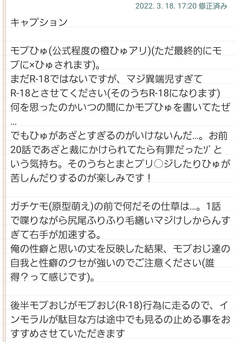 MOBojiminarai☆quiet followDONE(終)性癖と言う名の絆で繋がっているモブおじさん達がひゅに狂っていくチャット的な #モブひゅ mob-human show all(+16 images) Tap to full screen (size:1080x1572).Repost is prohibited Let's send reactions! freqpopularsnackothersPayment processing Replies from the creator Follow creator you care about!☆quiet follow MOBojiminaraiSPOILERGR!!3話の感想 9 MOBojiminaraiSPOILER 3312 MOBojiminaraiDONE(終)性癖と言う名の絆で繋がっているモブおじさん達がひゅに狂っていくチャット的な 17 MOBojiminaraiDONE性癖と言う名の絆で繋がってるモブおじさん達がひゅに狂っていくチャッ卜的な 10 MOBojiminaraiMAIKING平君シコすぎるな……超中途半端なところで終わる。むしろこの先が本番いやなんかめっちゃ唐突に始まってしまった……(欲望が先行した結果)まあいいか…… 1879 MOBojiminaraiDONE例の🍛回(14話)のその後の遊ロア① 5 related works MOBojiminaraiDONE性癖と言う名の絆で繋がってるモブおじさん達がひゅに狂っていくチャッ卜的な 10 MOBojiminaraiDONE(終)性癖と言う名の絆で繋がっているモブおじさん達がひゅに狂っていくチャット的な 17 recommended works yktukiDONE遊ロア。逆襲のシャイン放送前捏造。 4090 MOBojiminaraiMAIKING平君シコすぎるな……超中途半端なところで終わる。むしろこの先が本番いやなんかめっちゃ唐突に始まってしまった……(欲望が先行した結果)まあいいか…… 1879 MOBojiminaraiSPOILER 3312 T4R7P3GDOODLE『塩素に臨海』現行&未通過❌異常事態 rusalt5220_2PROGRESSダウナー系ギャル(弁護士)探索者描いてる途中自分で見てる分にはちゃんと立ててるように見えるけど実際どうなんだろ…いずれ肌の大半が隠れるので記録用にあと私はスーツ着た女は脚太い方が好きなのかもしれないと気付いた※全裸(B地区も(デフォルメ気味だけど)かきかけてるので注意) choko_milk00DONE 期間限定DOODLEタケルと広のお誕生日に描いた絵。この絵は各々のプロデューサーやユニット仲間、級友に対して言っているセリフとも取れるようにしてるんだけど、絵のテイストを合わせたので2人が喋っているようにも見えるという絵。タケルは貰ったものをちゃんと食べて(その分運動するらしい)くれるので、困惑しつつも食べてくれるんじゃないかなぁと思う。広も大切な人からもらった善意なら頑張って食べてくれそうなんだけど無理しないでね。 3 kurusu_77SPOILER大有 崎明噩梦over18?(yes/no) 3313 MINDONEDearestKindlerFinale 無配なんの季節感もないですが1コマ目ですべてがわかってしまうdnkb(付き合ってない)です。パスは数字+英字(8桁)22日20:45に1枚らくがき足しました!23日19:20に1枚とあとがき?足しました! 7