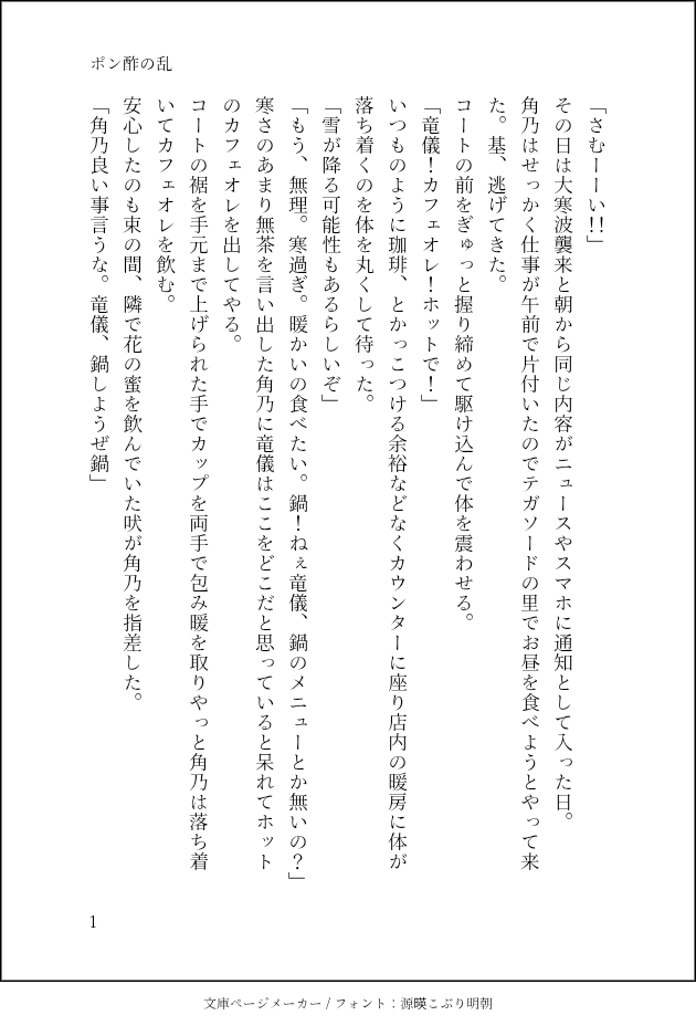 gol_go_gol☆こそフォロらくがきポン酢がキーアイテムになる小説というよくわからんリクエストのやつです。お納めください。 すべて表示(+11枚) タップで全画面(原寸:630x928)無断転載禁止 リアクションをたくさん送って応援しよう! よく使う人気おやつその他支払処理中 作者からのリプライ 気になる人をどんどんフォローしよう!☆こそフォロ gol_go_golらくがきポン酢がキーアイテムになる小説というよくわからんリクエストのやつです。お納めください。 12 gol_go_golできた玲さんと竜儀が互いに向き合う話 6 gol_go_gol過去のを晒す当時書いてたキングオVSキョウリュウのその後。ハスティー兄弟がどうだったのか…。 7 gol_go_golできた揚げまんじゅうさんの企画参加させていただきました!碧くんと竜儀のお話 6 gol_go_golできたhttps://poipiku.com/2736194/12250074.htmlこちらの続き。二人でオムライス作る話 9 gol_go_golできた竜儀がいなくなった夜、1人オムライスを作る吠の話 おすすめ作品 紫陽花メモハスティー兄弟のイメソンプレイリスト五話の衝撃がとても強くて勢いで作りました妄想のお供に 2 秋月蓮華できたキングオージャー夢でギラ夢これのじゃなくてとだなとおもった 2135 秋月蓮華できたキングオージャー夢でトウフ国の話ギラと夢主が会話してるだけ 1344 秋月蓮華できたきんぐおじゃログ。昔話2ギラとの話 2165 秋月蓮華できたログで上げておく模造幼少期にさらにカグさんをたしてみたはなし。いつもの夢主 825 秋月蓮華できたきんぐおじゃゆめで幼少期模造じきしゅごだむこくおうが食べさせてるのは家がめんどくさいため先代トウフの王も模造だよ 805 秋月蓮華できたラ王が彼女の歌を聴く話認識は妹分です 秋月蓮華できたギラとの話。ぱんけーきうめえ 秋月蓮華できた夢主とリタとのんびりする話ですとちゅうで降ってきたネタも入れました。最後の方はちょい伏線 586