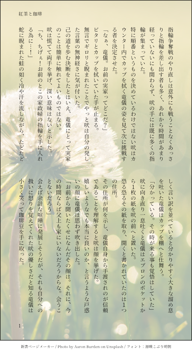 gol_go_gol☆こそフォロらくがき召子さんに会いに行く吠。屋敷は完全捏造です。懺悔室ネタあります すべて表示(+5枚) タップで全画面(原寸:618x1132)無断転載禁止 リアクションをたくさん送って応援しよう! よく使う人気おやつその他支払処理中 作者からのリプライ 気になる人をどんどんフォローしよう!☆こそフォロ gol_go_golらくがき召子さんに会いに行く吠。屋敷は完全捏造です。懺悔室ネタあります 6 gol_go_golできた陸王復活ライブ後の二人。変わらない関係 3 gol_go_golらくがきポン酢がキーアイテムになる小説というよくわからんリクエストのやつです。お納めください。 12 gol_go_golできた玲さんと竜儀が互いに向き合う話 6 gol_go_gol過去のを晒す当時書いてたキングオVSキョウリュウのその後。ハスティー兄弟がどうだったのか…。 7 gol_go_golできた揚げまんじゅうさんの企画参加させていただきました!碧くんと竜儀のお話 6 おすすめ作品 紫陽花メモハスティー兄弟のイメソンプレイリスト五話の衝撃がとても強くて勢いで作りました妄想のお供に 2 秋月蓮華できたキングオージャー夢でギラ夢これのじゃなくてとだなとおもった 2135 秋月蓮華できたログとしてあげておくきんぐおじゃ夢小説模造幼少期ヒロインとハスティー兄弟 954 秋月蓮華できたギラと夢主の話。短い 秋月蓮華できたきんぐおじゃゆめで幼少期模造じきしゅごだむこくおうが食べさせてるのは家がめんどくさいため先代トウフの王も模造だよ 805 秋月蓮華できたギラが彼女の歌を聴く話歌はムーンライトメロディです 秋月蓮華できたギラとの話。ぱんけーきうめえ 秋月蓮華できたきんぐおじゃ夢、ある日の一コマ。タキタテ城はカオス。 秋月蓮華できたギラとの話夢主一人称。なんかこの二人は儚い世界が書きやすい