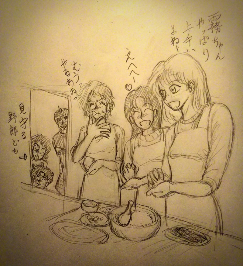 少し大人になった唯ちゃん千絵ちゃん霧ちゃんが一緒におにぎりを結ぶの図プラス野郎ども付きw