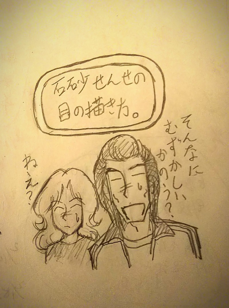 なんやらネットを見てると「石砂せんせの目の描き方、難しーw」という感じみたいなので、ちょいちょいと描いてみた「石砂せんせの目の描き方」。