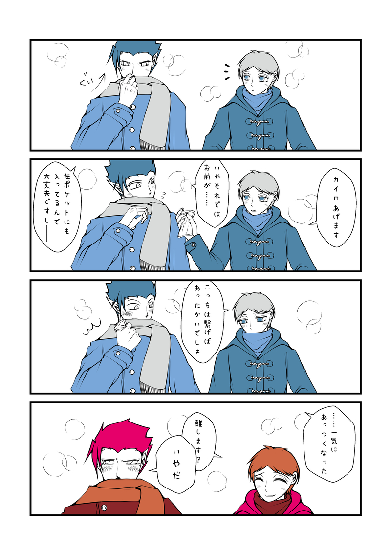 マフラー派の半田くんとネックウォーマー派のサギョウくん
