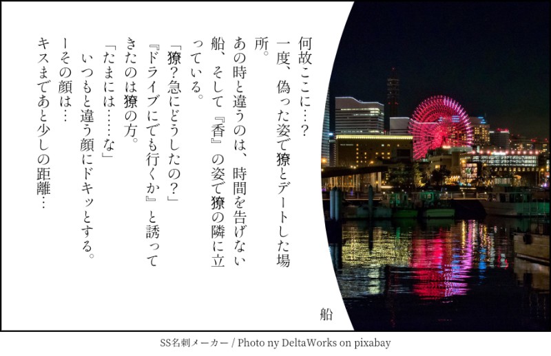細雪とこの獠香で「「たまには……な」」と「船」のお話はどうでしょう? 1ツイート(140字)程度だと嬉しいですっ!