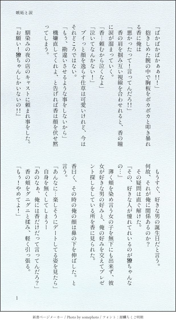 Sasame☆quiet followREHABILI1時間以内に4RTされたら、細雪とこの獠香がばかばかばかっ! と言っているシーンをかいてみるね☆#shindanmakerhttps://t.co/ZQoLTsmLmSお題2つめ!!リツイートありがとうございましたぁ!! #シティーハンター cityHunter #獠香 ##CH show all(+1 images) Tap to full screen (size:618x1132).Repost is prohibited SasameDONEタイッツーで上げたものをこちらでもw大晦日の夜のRKです(R18)18歳以上?(yes/no) 1982 SasameTRAININGCHADの冴羽家キッチンにあるボードに貼られたメモ見てからの妄想ですw獠と行きつけ店のママとの会話。CHAD以前のお話で書いてます(*ノ>ᴗ<)テヘッタイトル安直どうにかならないのかな……(白目) 2523 SasameDONE急に降ってきた香ちゃん家出ネタです。まぁ、実際無いだろうなって内容なのですが細雪の妄想ですからエヘッ(*´ω`*)ゞ合わないと思われたら即回れ右でお願いいたします。 3959 SasameDOODLEあるお題を元に書いたけど、いつもと違うパターンなので上げ直しました。冴子と獠を好きなモブ娘の話。合わないときはそっと閉じでお願いします。 2410 SasameDOODLE観光スポット特集📺観てる獠香。朝からイチャつく獠香が降臨したw注:服は着てます(なんの注意なのかwww)✽お知らせもなく投稿していたポイピクに気づいてもらえたこと、リアクションを頂けて嬉しいです🥰ありがとうございます☺️☺️☺️ 418 SasameDONE獠ちゃんハピバ⸜(*´꒳`*)⸝✨✨✨ 528 related works こよみTRAININGこよみんちの獠と香で「バスタイム」と「モーニングキス」のお話はどうでしょう? 1ツイート(140字)以下だと嬉しいですっ!#CHしたったー #shindanmakerhttps://shindanmaker.com/965157ギャグ路線?😅お題の言葉は直接は使ってない😅直接表現はしてないので、全年齢。 SasameREHABILI細雪さんとこの獠と香で「銃弾」と「かすめる」のお話はどうでしょう? 2ツイート(280字)程度だと嬉しいですっ!#CHしたったー #shindanmakerセイラネタで失礼します💦💦 rumuu_miiroDONE色塗りも上手くなりたい〜210131 SasameREHABILIしつこくポイピク💦💦こ、これには、訳がありまして💦💦チョコメッセージ頂いた事により舞い上がった、お馬鹿な細雪の元にネタが…獠ちん、香にゃんが『ちゃんとお礼をしろ!』と言ってたのでの投稿であります💦しつこくてごめんにゃい 4 SasameREHABILIバレンタインに激しい愛を♥♥♥ SasameREHABILI細雪んちの獠香で「ローマン」と「防弾コート」のお話はどうでしょう? 5ツイート(700字)以下だと嬉しいですっ!#CHしたったー #shindanmakerhttps://t.co/ou3tHxbMVHCH上映会でセイラ回が頭から離れなかったご様子…うん、頑張ったwww 2 こよみTRAININGこよみの獠香で「夜這い」と「催眠術」のお話はどうでしょう? 4ツイート(560字)程度だと嬉しいですっ!#CHしたったー #shindanmakerhttps://t.co/pVfxz1idO3字数がちょっと少なかったかな?気にしない!「夜這い」と「催眠術」でびっくりでしたが、こんな感じになりました。 SasameREHABILIあなたは細雪んちの獠香で【噛んで微笑ってもう一度キス / あれは嘘だった】をお題にして140字SSを書いてください。#shindanmakerhttps://t.co/FT9UR8u5Hs『血の証』を見た獠ちんからクレームがありまして「書き直せ!!」と言われちまったよ…(*꒦ິ꒳꒦ີ*)獠ちんが悪いんじゃん!! かほる(輝海)DONEシティーハンター冴羽獠×槇村香原作以上の関係書き手募集していたのでびんじょった(*´ω`*)Rさま(@ryu_wen)ありがとうございました!Rんちの冴羽くんと香で「唇」と「「ばぁか」」のお話はどうでしょう? 1ツイート(140字)程度だと嬉しいですっ!#CHしたったー #shindanmakerhttps://t.co/2IQJRYQwf0 recommended works わくわくわPAST背景は拾ってきちゃった かほる(輝海)DONEシティーハンター冴羽獠×槇村香原作以上の関係あなたはかほるさんちのKで【待てない / 夢中になるから】をお題にして140字SSを書いてください。#shindanmakerhttps://shindanmaker.com/780366すっかり絆されちゃって…(´;ω;`)ウッ… 149 LAL_ConspiratorDONEContents: Prequel to Near Future, rough kissing, closeted feelings, frotting, implied wet dreamPassword is Livingstill's JP name. 8762 bowDOODLEリク③以前ポイピクに載せた👿🌷×✝🐯のエッの詳細です詳細というかフィニッシュ時の二人?ちょっと影は載せれてないのですが、よかったら…(後ほど影付き載せるかもです!)リクありがとうございました!!!pass 18歳以上ですか? y/n 2 mashibaxxxDOODLE別のところにあげていたもの 触手プレイAIイラストDONE 6 mashibaxxxINFOそれでも夜が明けるなら リンクです20日20時より告知開始です22日20時より予約開始ですhttps://ecs.toranoana.jp/joshi/ec/item/040031161004/ astro_moimoiDOODLE🐟👔🐟3P souziki147DOODLEプロスマ喜の秘匿含む絵 3