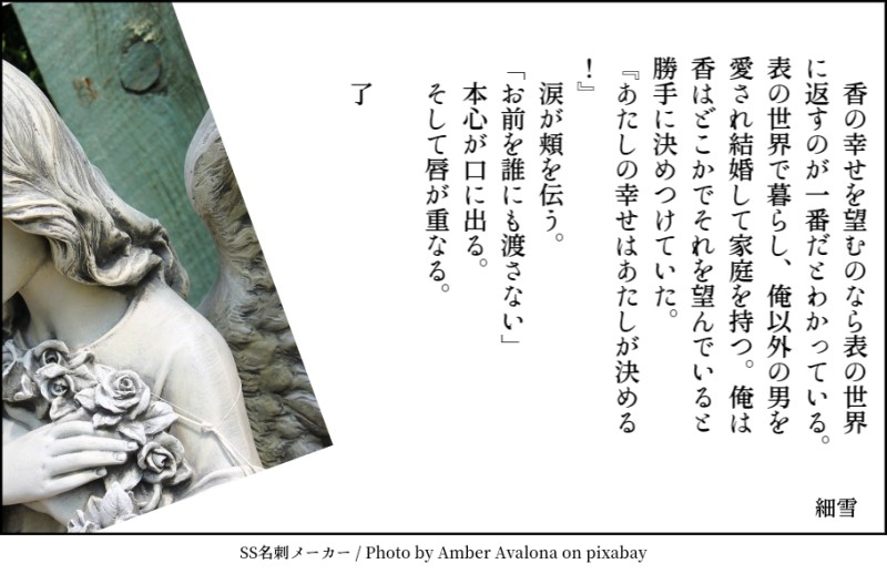 Sasame☆quiet followDONE貴方は細雪んちの獠香で『誰にも渡さない』をお題にして140文字SSを書いてください。#shindanmaker😑😑😑 #冴羽獠 saeha #槇村香 makiMurakami ##CH Tap to full screen (size:910x590).Repost is prohibited SasameDONEタイッツーで上げたものをこちらでもw大晦日の夜のRKです(R18)18歳以上?(yes/no) 1982 SasameTRAININGCHADの冴羽家キッチンにあるボードに貼られたメモ見てからの妄想ですw獠と行きつけ店のママとの会話。CHAD以前のお話で書いてます(*ノ>ᴗ<)テヘッタイトル安直どうにかならないのかな……(白目) 2523 SasameDONE急に降ってきた香ちゃん家出ネタです。まぁ、実際無いだろうなって内容なのですが細雪の妄想ですからエヘッ(*´ω`*)ゞ合わないと思われたら即回れ右でお願いいたします。 3959 SasameDOODLEあるお題を元に書いたけど、いつもと違うパターンなので上げ直しました。冴子と獠を好きなモブ娘の話。合わないときはそっと閉じでお願いします。 2410 SasameDOODLE観光スポット特集📺観てる獠香。朝からイチャつく獠香が降臨したw注:服は着てます(なんの注意なのかwww)✽お知らせもなく投稿していたポイピクに気づいてもらえたこと、リアクションを頂けて嬉しいです🥰ありがとうございます☺️☺️☺️ 418 SasameDONE獠ちゃんハピバ⸜(*´꒳`*)⸝✨✨✨ 528 related works aosabikinakoTRAINING貴方はハル相で『最大級の口説き文句』をお題にして140文字SSを書いてください。#shindanmakerhttps://shindanmaker.com/375517 かほる(輝海)DONEシティーハンター冴羽獠×槇村香原作以上の関係かほるさんちの香で「生きる」と「地獄」のお話はどうでしょう? 5ツイート(700字)以下だと嬉しいですっ!#CHしたったー #shindanmakerhttps://shindanmaker.com/965157何か暗い感じになっちゃったけど、これで許して…(´・ω・`)この後は二人で天国へ行った(イッた?)に違いない(*´艸`*) 2 かほる(輝海)DONEシティーハンター冴羽獠×槇村香原作以上の関係あなたはかほるさんちの香ちゃんで【癖になるかも / 行儀の悪さは艶やかさ】をお題にして140字SSを書いてください。#shindanmakerhttps://shindanmaker.com/780366これはお行儀が悪い方が萌える(*´艸`*) opinel432DONETSりんわかBLさんは『もしかして誘ってる?』をお題に、140字でSSを書いてください。#shindanmakerhttps://shindanmaker.com/320966 rick_underworldDONE貴方は🌹→☕️で『口説き落としてみせる、って』をお題にして140文字SSを書いてください。2022/12/13そう思っていたのに、#shindanmakerhttps://shindanmaker.com/587150 かほる(輝海)DONEシティーハンター冴羽獠×槇村香原作以上の関係書き手募集していたのでびんじょった(*´ω`*)Rさま(@ryu_wen)ありがとうございました!Rんちの冴羽くんと香で「唇」と「「ばぁか」」のお話はどうでしょう? 1ツイート(140字)程度だと嬉しいですっ!#CHしたったー #shindanmakerhttps://t.co/2IQJRYQwf0 SasameREHABILIあなたは細雪んちの獠香で【噛んで微笑ってもう一度キス / あれは嘘だった】をお題にして140字SSを書いてください。#shindanmakerhttps://t.co/FT9UR8u5Hs『血の証』を見た獠ちんからクレームがありまして「書き直せ!!」と言われちまったよ…(*꒦ິ꒳꒦ີ*)獠ちんが悪いんじゃん!! SasameREHABILIあなたは細雪んちの獠香で【噛んで微笑ってもう一度キス / あれは嘘だった】をお題にして140字SSを書いてください。#shindanmakerhttps://t.co/FT9UR8u5Hs過去最短で書いた気がする( *¯ ꒳¯*)フフン こよみTRAININGこよみんちの獠と香で「バスタイム」と「モーニングキス」のお話はどうでしょう? 1ツイート(140字)以下だと嬉しいですっ!#CHしたったー #shindanmakerhttps://shindanmaker.com/965157ギャグ路線?😅お題の言葉は直接は使ってない😅直接表現はしてないので、全年齢。 recommended works あやか/すずかMAIKING線画ようやく終わった。。。#とびだせ新宿・ご当地CH 用です。 かほる(輝海)OFFICIALシティーハンター(冴羽獠×槇村香)で掌編小説。原作以降設定。絵はかけないけど小説で参加してみたぞ(・∀・) ふみお/のくろDOODLEちっちゃい相棒意味はないです…。なにか困った事になったのでしょうそしてRaiotの方がずっと落ちていて向こうにアップ出来ない…。まさかRaiotサービス終了してしまったのだろう…か… かほる(輝海)DONEシティーハンター冴羽獠×槇村香原作以上の関係あなたはかほるさんちのRで【ココで確かめて / シャツをぱたぱた】をお題にして140字SSを書いてください。#shindanmakerhttps://shindanmaker.com/780366 152 えどさきDONEカケタイ R-18 フェ●好きな子のこと気遣えるタイガくんとってもえらいの絵パス…18↑? y/n かほる(輝海)DONEシティーハンター冴羽獠×槇村香原作以上の関係あなたはかほるさんちのRKで【冷えた体が / イイって言うまで止めないよ?】をお題にして140字SSを書いてください。#shindanmakerhttps://shindanmaker.com/780366正直に言ったって、止める気ないくせに😂 151 ROMc_mDOODLEアソ龍 aso/⚧️ryu/aso たちなだ ゆうDOODLE女体じゃないエイルシ 触手プレイAIイラストDONE 6
