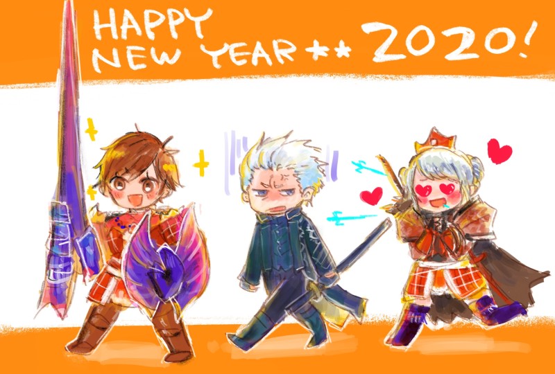 モンハン一緒によく遊んでくださる友人へ向けた年賀状です。友人のマイキャラ、バージル、私のマイキャラ の順番で並んでおります😌⭐️