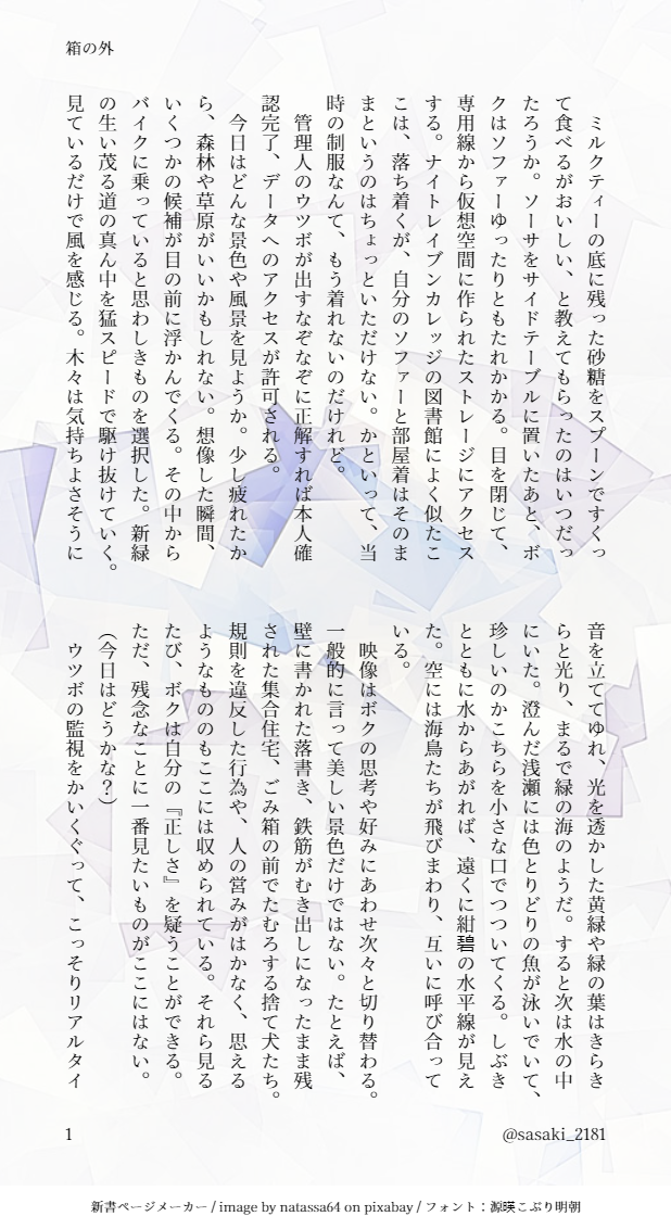 ささき☆quiet followDONEフロリド ワンドロよりお題「箱詰め」。かなり趣味に走りました。相手、相手の一部を箱に詰めて旅するお話には永遠のロマンがあります。ややグロテスクな表現あり。 show all(+2 images) Tap to full screen (size:618x1132).Repost is prohibited Let's send reactions! freqpopularsnackothersPayment processing Replies from the creator Follow creator you care about!☆quiet follow ささきDONE綱茨 Fairy tail(現パロ)警察官渡辺綱と歓楽街の小劇場でバイトしている高校生茨木のお話です。ワルツコラボの時に爆発した妄想です。前後編の前編ですので後編がでし次第、ポイピクとpixivで公開します。 11 ささきDONE綱とサロメ 斬ること、見ること、愛すること綱→茨前提の綱とサロメちゃんの会話劇です。綱さんが結構病んでますので苦手な方はご注意ください。サロメちゃんのセリフは光文社古典新訳文庫のサロメを参考にさせていただきました。この新訳サロメは訳も素敵ですし、解説も面白いのでサロメちゃんが好きな方は是非読んでみてください! 4 ささきDONE異聞 綱茨 生前軸戻橋のお話をもとにしたお話です。当時の衣装については皆様お馴染み、平凡社 有職故実の世界 (別冊太陽)を参考にしております。 5 ささきDONE綱茨 キッチン カルデア軸綱と茨木でお菓子を作ります。果たしてどうなることでしょう。ほのぼの。 12 ささきDONEフロリド ワンドロよりお題「箱詰め」。かなり趣味に走りました。相手、相手の一部を箱に詰めて旅するお話には永遠のロマンがあります。ややグロテスクな表現あり。 3 ささきDONE星とシロセミ 2021ホワイトデーイベント後 2 recommended works にゃんちゃんCAN’T MAKEアイコン用に描いてたやつ AmA°DOODLEマフラーとマリーちゃんとデオン色鉛筆練習のアマデウス#FGO#マリー#デオン#アマデウス 3 m_harukiTRAININGロビン練習30✕303倍ズーム soreiketoruDOODLEつい落書いてしまった……色々終わったら絶対ちゃんとかく〜〜〜〜グっちゃんマジ欲しい……(引けませんでしたてか、後ろのはだけ具合からいくと、衣服:肌=4:6くらいなんじゃ…いやー素敵やね(キリ今年もなんやかんやでFGO楽しみました来年も好きなことができますように#FGO #虞美人 オアスシDONE紅閻魔先生 6064TRAININGキングプロテアちゃん欲しかったよ〜〜 2 カリンパ㊷DONESUSHI 玉子黒弓さん 123_yuitiDOODLEFGOフェス、ぐだ達の衣装かわいいよね 後藤DONEラムダリリス 好き聖杯捧げた