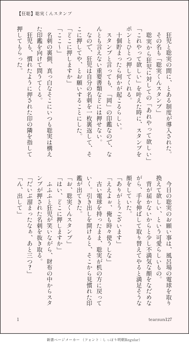 うみtearsun127☆quiet followDONE狂聡ナリタタン2024「聡実くんスタンプ」二人の間で決めた約束のお話。 #狂聡 madGenius show all(+5 images) Tap to full screen (size:618x1132).Repost is prohibited Let's send reactions! freqpopularsnackothersPayment processing Replies from the creator Follow creator you care about!☆quiet follow うみtearsun127MAIKINGやるぞーと意気込んできたけど寝ちゃった聡みくんの顔を見ながら抜いたら寝ぼけた聡みくんがお掃除フェラしてきて大ハッスルしておせっせする話です。まだ書きかけ(ネタお借りしました)成人済み?y/n 2984 うみtearsun127DONEナリタタン2025辞め暴狂児の同棲狂聡です。成田お誕生日おめでとう。 5 うみtearsun127MAIKINGヤ関連で攫われた聡みくん、ショックで声を無くしてしまって(もう自分は狂じにとって存在意味が無いな)と思って姿を消す話。書きかけ。 12 うみtearsun127MAIKING狂聡、しばらくおせっせ出来てなかった二人がなだれ込むようにせっせする話。書きかけ、最初からドスケベしてます。06/18追記 書けたどー!!!https://www.pixiv.net/novel/show.php?id=25085678成人済み?y/n 5456 うみtearsun127DONE狂聡「縋る鶴、見えぬ虎」キャバに誘われて、嬢から「彼氏のナリタさん」の話を聞く聡実くんのお話。4924、聡実くんが就職済み、大阪へ戻っています。 13 うみtearsun127PROGRESSサブドム狂聡です。Sub狂児×Dom聡実くんの、コマンドプレイです。 2480 related works ふちさきDONE⚠️ 3914 狂聡♀「誘拐契約」https://x.com/huchi_k2/status/1799911114815463480?s=46 4 あらうみDOODLEファ。15話の感想をだらだらと書いてみました。考察じゃなくてあくまで感想。本誌ネタバレ防止ワンクッションです。 4396 ちょきDONE狂聡 HAYASEDOODLE🔞えっちしてる(だけの)狂聡 挿入あり 独占欲強め成田 ↑18?yes/no 10 モズさんのポイポイDONE狂聡ねこ₍˄·͈༝·͈˄₎◞ ̑̑₍˄·͈༝·͈˄₎◞ ̑̑ LFjIort6SiZnaMmMOURNINGこういうスタンスの狂聡ももえる 6 カフェラテDONE狂聡 おいしいよ! 2 mitaka_05050401DONE20220401🎂岡聡実生誕祭💖聡実くんお誕生日おめでとうございます!文字なしと加工なしver.もアップします 4 unXXXhmMOURNING行為中に狂児の顔よく見えないなって思って、狂児と会う時だけコンタクトに切り替える聡実くん※狂児の刺青どうなってるか分からないので適当です 5 recommended works モズさんのポイポイDONE狂聡ねこ₍˄·͈༝·͈˄₎◞ ̑̑₍˄·͈༝·͈˄₎◞ ̑̑ mitaka_05050401DONE0616出逢い記念日絵の原寸と加工前ですです 2 budori_karaokeMOURNING浮気をしてみたい聡実くんと、聡実くんのことが大好きな成田さんの話です。R部分はたいしたことありません。なんでもお許しいただける方…よろしければ… 11 yawaraka_fuyodoDOODLEなぞのパロ みるくMOURNING🌟🎈将参派生パロとpkmnパロ時空2です。前に出したかった子達を出したい欲に負けました。何でもオッケーな方、推奨です。 4823 茶金時DOODLE映カ狂聡らくがき🎤❗️脚が長すぎて何度見ても新鮮にびっくりする🦀パスワード小英字数字 2 tama__tamaminMOURNING狂聡 なりたのなりたをかっこよく描きたかった🥺r18 (y/n) budori_karaokeMOURNING大雪でいたしかたなく初めてさとみくんの部屋に入っちゃうそして泊めてもらう成田さんの話です。す…⚪︎…た…があります(あります?)。よろしければ… 11 unXXXhmMOURNING※構図借りましたさとみくんにオナホ使わせて色々と指示をするきょうじさん(続きません)