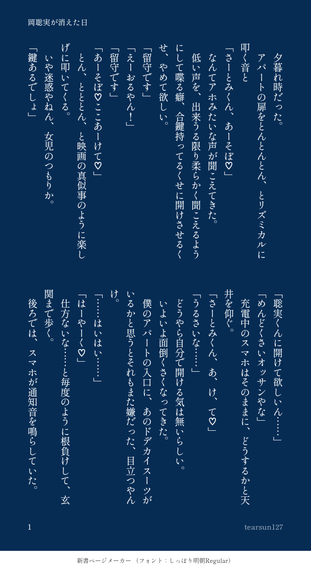 うみtearsun127☆quiet followPROGRESS「岡聡実が消えた日」 ホラーです。狂聡です。書いている人がホラー初心者なので、薄目でお楽しみ下さい。 #狂聡 madGenius show all(+21 images) Tap to full screen (size:618x1132).Repost is prohibited Let's send reactions! freqpopularsnackothersPayment processing Replies from the creator Follow creator you care about!☆quiet follow うみtearsun127MAIKINGやるぞーと意気込んできたけど寝ちゃった聡みくんの顔を見ながら抜いたら寝ぼけた聡みくんがお掃除フェラしてきて大ハッスルしておせっせする話です。まだ書きかけ(ネタお借りしました)成人済み?y/n 2984 うみtearsun127DONEナリタタン2025辞め暴狂児の同棲狂聡です。成田お誕生日おめでとう。 5 うみtearsun127MAIKINGヤ関連で攫われた聡みくん、ショックで声を無くしてしまって(もう自分は狂じにとって存在意味が無いな)と思って姿を消す話。書きかけ。 12 うみtearsun127MAIKING狂聡、しばらくおせっせ出来てなかった二人がなだれ込むようにせっせする話。書きかけ、最初からドスケベしてます。06/18追記 書けたどー!!!https://www.pixiv.net/novel/show.php?id=25085678成人済み?y/n 5456 うみtearsun127DONE狂聡「縋る鶴、見えぬ虎」キャバに誘われて、嬢から「彼氏のナリタさん」の話を聞く聡実くんのお話。4924、聡実くんが就職済み、大阪へ戻っています。 13 うみtearsun127PROGRESSサブドム狂聡です。Sub狂児×Dom聡実くんの、コマンドプレイです。 2480 related works モズさんのポイポイDONE狂聡ねこ₍˄·͈༝·͈˄₎◞ ̑̑₍˄·͈༝·͈˄₎◞ ̑̑ HAYASEDOODLE🔞えっちしてる(だけの)狂聡 挿入あり 独占欲強め成田 ↑18?yes/no 10 unXXXhmMOURNING行為中に狂児の顔よく見えないなって思って、狂児と会う時だけコンタクトに切り替える聡実くん※狂児の刺青どうなってるか分からないので適当です 5 ちょきDONE狂聡 カフェラテDONE狂聡 おいしいよ! 2 LFjIort6SiZnaMmMOURNINGこういうスタンスの狂聡ももえる 6 あらうみDOODLEファ。15話の感想をだらだらと書いてみました。考察じゃなくてあくまで感想。本誌ネタバレ防止ワンクッションです。 4396 mitaka_05050401DONE20220401🎂岡聡実生誕祭💖聡実くんお誕生日おめでとうございます!文字なしと加工なしver.もアップします 4 ふちさきDONE⚠️ 3914 狂聡♀「誘拐契約」https://x.com/huchi_k2/status/1799911114815463480?s=46 4