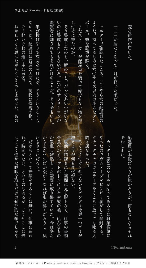 非常識☆quiet followMOURNINGついったに流したのと同じもの世にも奇妙などひふ、の導入。ひふみが失踪して何故かドール化して帰ってくる謎の話。永遠に完結しないので供養です。 show all(+3 images) Tap to full screen (size:618x1132).Repost is prohibited Let's send reactions! freqpopularsnackothersPayment processing Replies from the creator Follow creator you care about!☆quiet follow 非常識MOURNINGついったに流したのと同じもの世にも奇妙などひふ、の導入。ひふみが失踪して何故かドール化して帰ってくる謎の話。永遠に完結しないので供養です。 4 非常識PAST大好きなどぽちんになでなでしてもらいたいちまひちゃん 非常識PASTちまひサンタ in どぽちんの部屋 非常識PASTちまどひの3RIOMIXアニマルコーデの絵おおかみ君は犠牲となったのだ(ごめんね) 2 非常識MOURNINGどひふと言ってもいいのか(多分言っちゃだめ)幼馴染が戦闘員として徴兵されていた世界線の二人※捏造幻覚、推奨されない医療行為、一二三が怪我する、何もかもふわっとしてる 5 非常識MOURNINGフリートの再放送(増える)🥂リョナ中心 13 recommended works ボーダー猫ジャッキーDOODLE「チ。」バデーニED横顔イラスト。 2 halluDOODLE26 美鈴(新刊通販)DONE🍄受けウェブオンリーでレマで申し込んだのに、レマが一作もない悲劇を回避するため急遽描いたちょっとえっちなレイマシュウェブオン会場でパス掲示します 2 ryuuduki324DOODLEアンノウンの猫ビームで猫化してしまったアカネをもとに戻すべく奮闘するエルダの面々だったが、フォールデン家の門限が刻々と迫る!逃げ足身軽なアカネコを捕まえるのも至難の業、そこへアカネの兄、アサヒが現れて…!?シンカリオン第222話、2月22日は猫の日!お楽しみに! leleRageDOODLE空いちゃったウツホpass→ fastener 3 ムサ🖋SS保管庫MAIKING【SS】皇紫←浄になる話。紫くんに手を出そうとしたら、こーきさんに先に手を出されてる事に気づく浄っていいなぁ、と思って。紫くんと浄が喋ってるだけです。浄、間男が似合いすぎる。完成版はPixivにアップいたしました。 1100 アルドラのTRPG事情とかSPOILER 2 えーにしPAST唐突に過去まんが ⚠️すけべ注意きみととける夢(ささくう🔞) 2 cuzki17DONELet my feelings reach you🩷*ポーズに参考あります